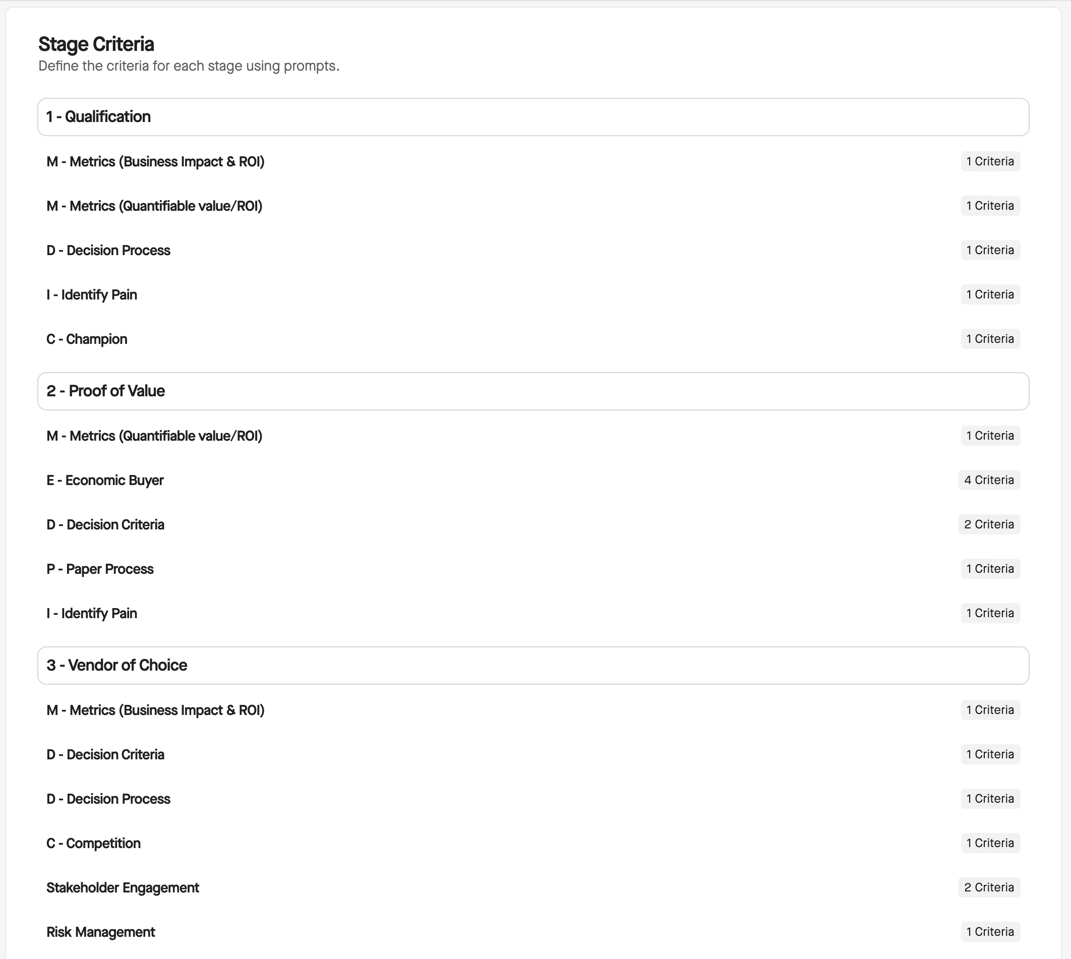- Deal Stage Configuration: Define qualification criteria for each stage in your sales process. Upload your sales methodology document to auto-generate criteria, then refine the output to match your requirements.