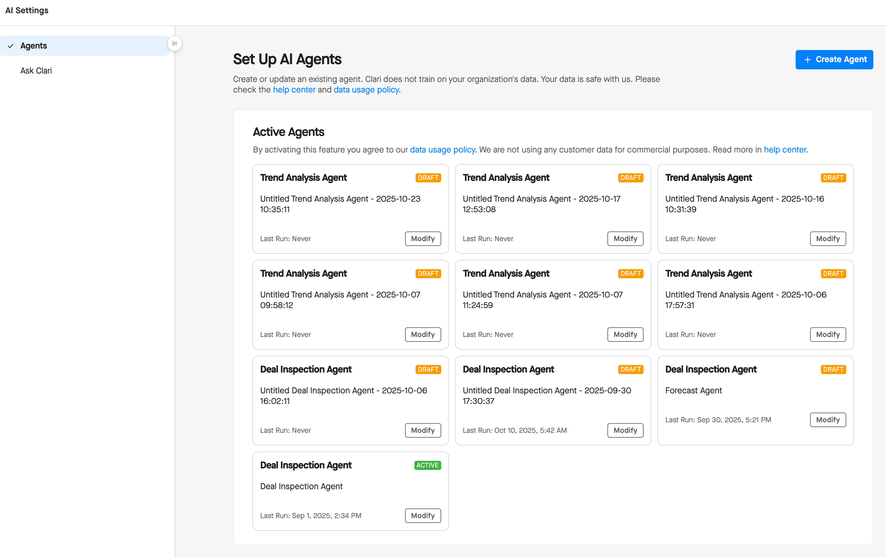 - Agent Hub Access: Navigate to AI Settings in Clari Studio to view and manage agent templates. Your organization starts with AI Agents disabled. You must opt in through the feature toggle to begin configuration.