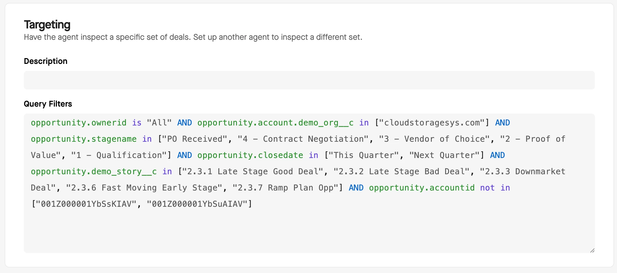 - Target Rules: Specify which opportunities the agent should analyze using SQL-style queries against RevDB fields. Target rules determine the deals included in each agent run.