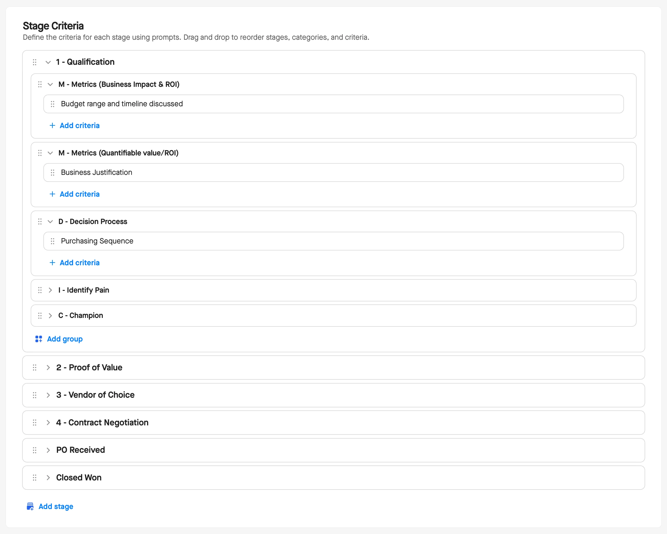 Create custom categories to organize criteria in ways that match your sales methodology. Move criteria between categories, reorder items, and nest related concepts together.
