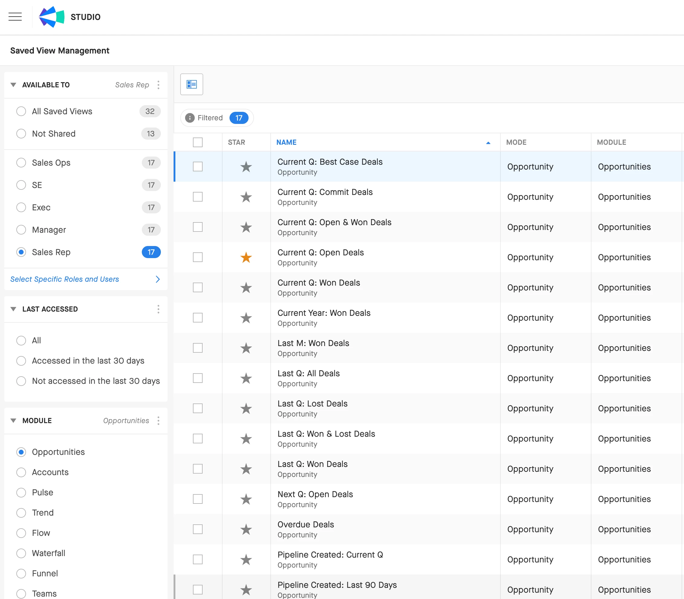 Bookmarking Saved Views with Stars πallows admins to bookmark high priority saved views that are shared across your GTM organization in Clari.