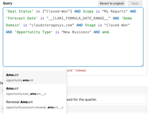 Say we need to add a new filter, say “Amount is not greater than 0” -- all we would need to do is add an AND and we can spell out the filterset we need. Keep in mind to ensure that we are adding the correct filterset by checking the appropriate SFDC API name underneath the Display name: