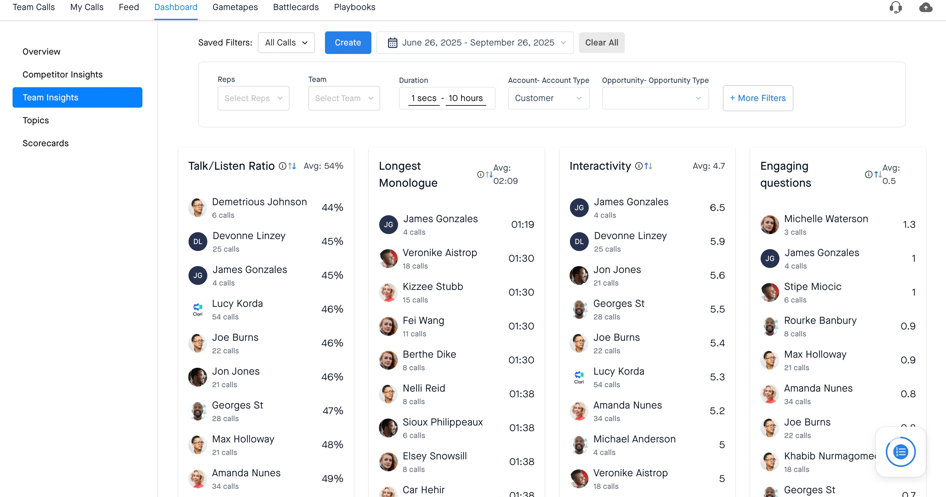 The Team Insights Dashboard ranks reps over a specified time period across four key metrics. These aren't just numbers; they are proxies for call quality that can reveal a lot about your team's conversations.