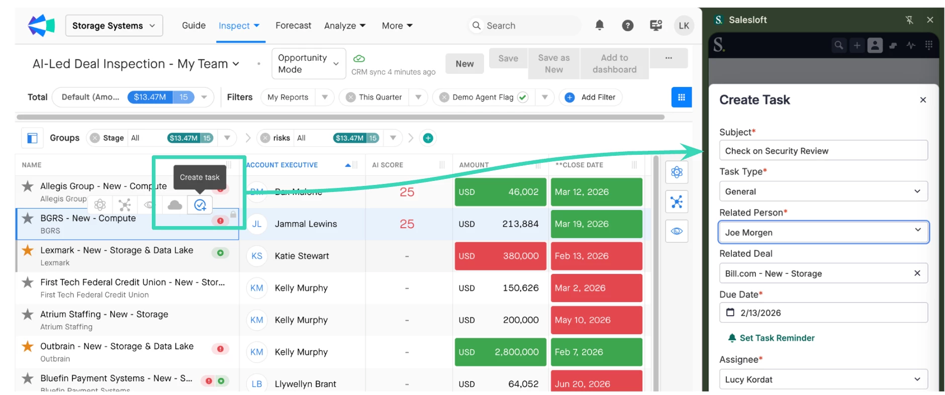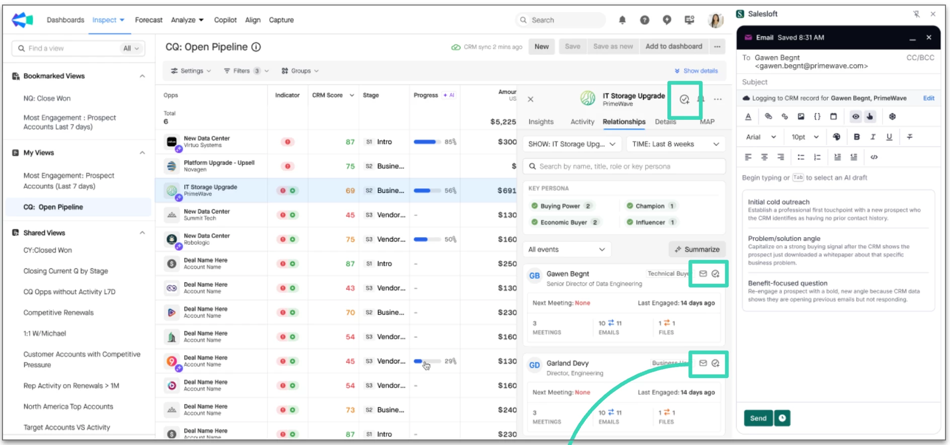 Quick Deal Inspection: Run through your reps' committed deals live, and have them create follow-up tasks or AI-generated emails in seconds, tracked and optimized in Salesloft.