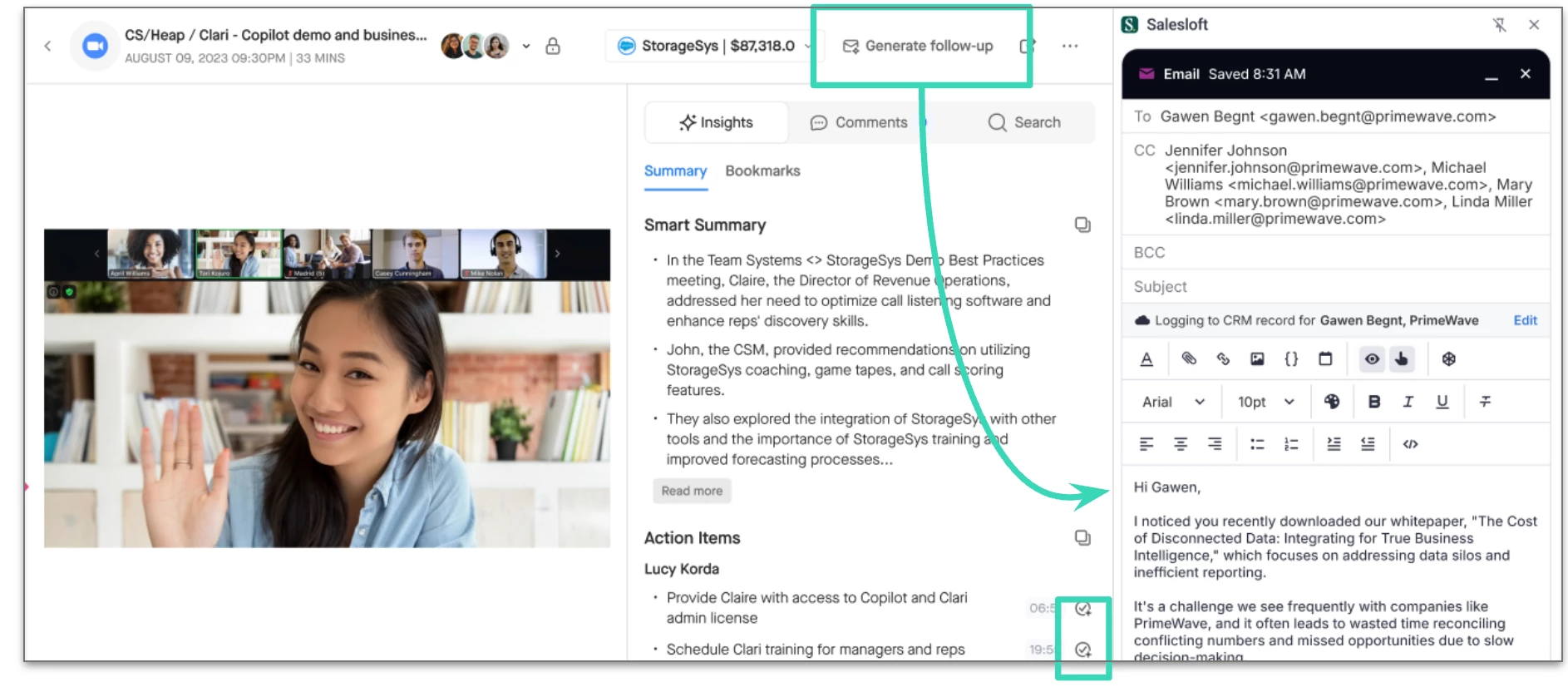 Now: One click. The summary is generated, populated into Salesloft with a subject line, and all call participants are copied automatically.