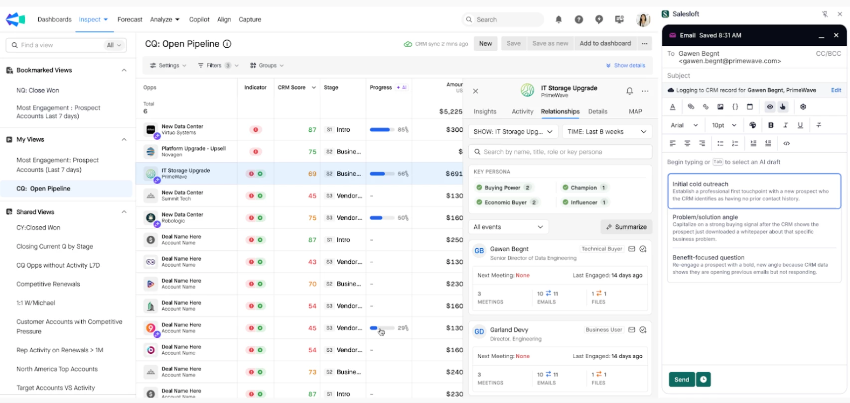 - While reviewing deals or accounts, you can send contextual, AI generated emails to key stakeholders with the click of a button.