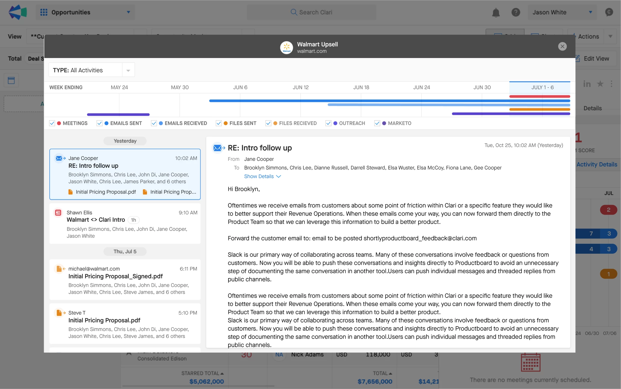 Supercharge your team’s deal inspection with Clari’s new Activity Detail View. Clari’s Activity Detail View is a central sales inbox that allows selling teams to pressure test CRM data with rich, real-time context from conversations that are happening via email body content and meeting recordings.