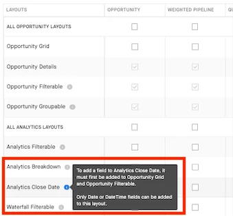 You must first add or edit the created date field you would like to add and then “check” the Analytics Close Date box under the desired mode in which you want it to appear as a selectable dropdown option in analytics: