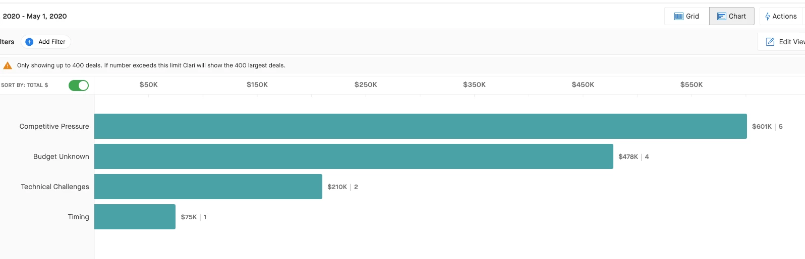 Looking at these groupings in Chart View made it way more efficient to visualize trends and share my findings with others (particularly Sales Leaders on our start of Q forecast calls, where we had wider slipped deal reviews).