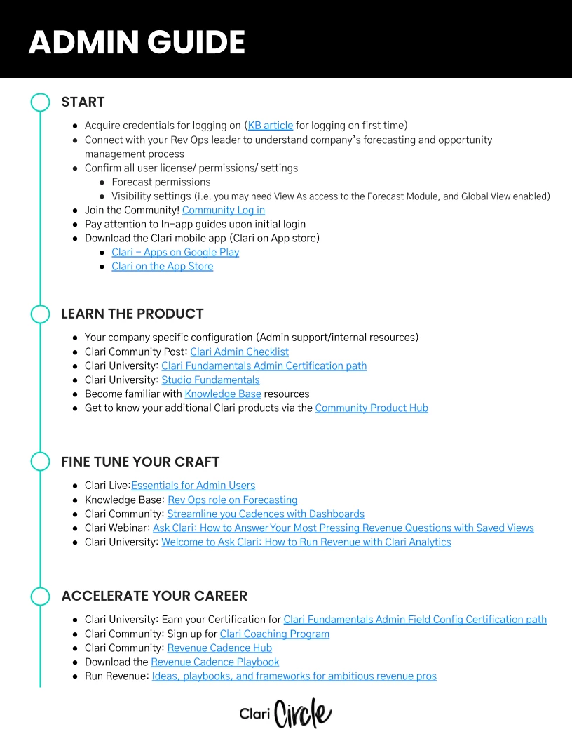 The Admin Learning Guide will walk you through everything you need to get started with Clari, build your expertise, and accelerate your career. It’s a journey. Here is your guide.