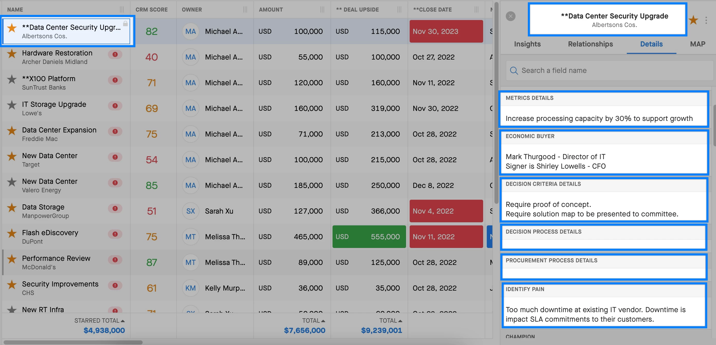 Once these fields are created, they can be added to your configuration. Generally, customers will put sales methodology fields in the details panel to help make deal inspection as simple as possible (example below)