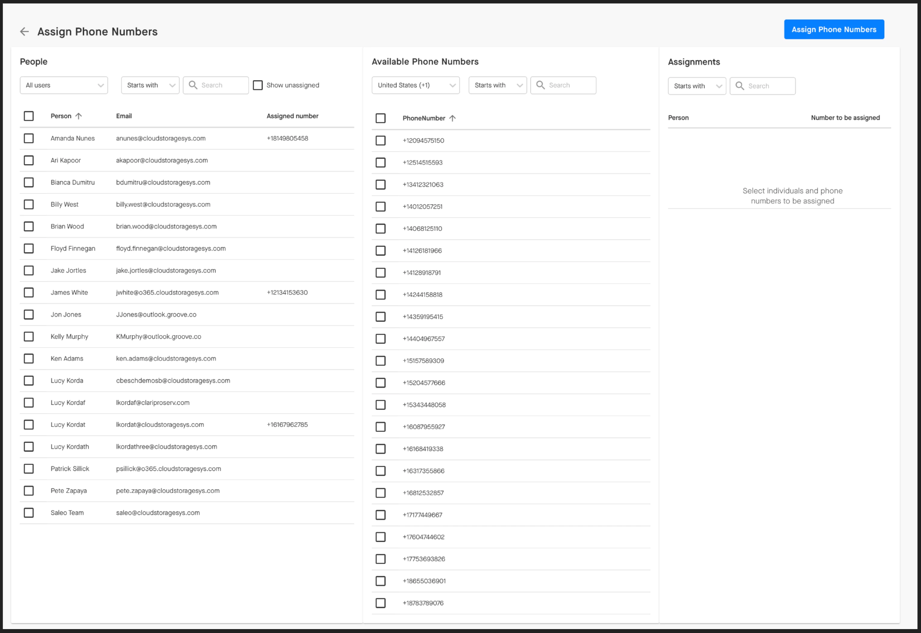 On this page, you can view all of the available phone numbers that your organization has, see which users are assigned to which numbers, and reassigned numbers to users as needed. Don’t forget to notify users of any changes that you make to their assigned phone number(s)!