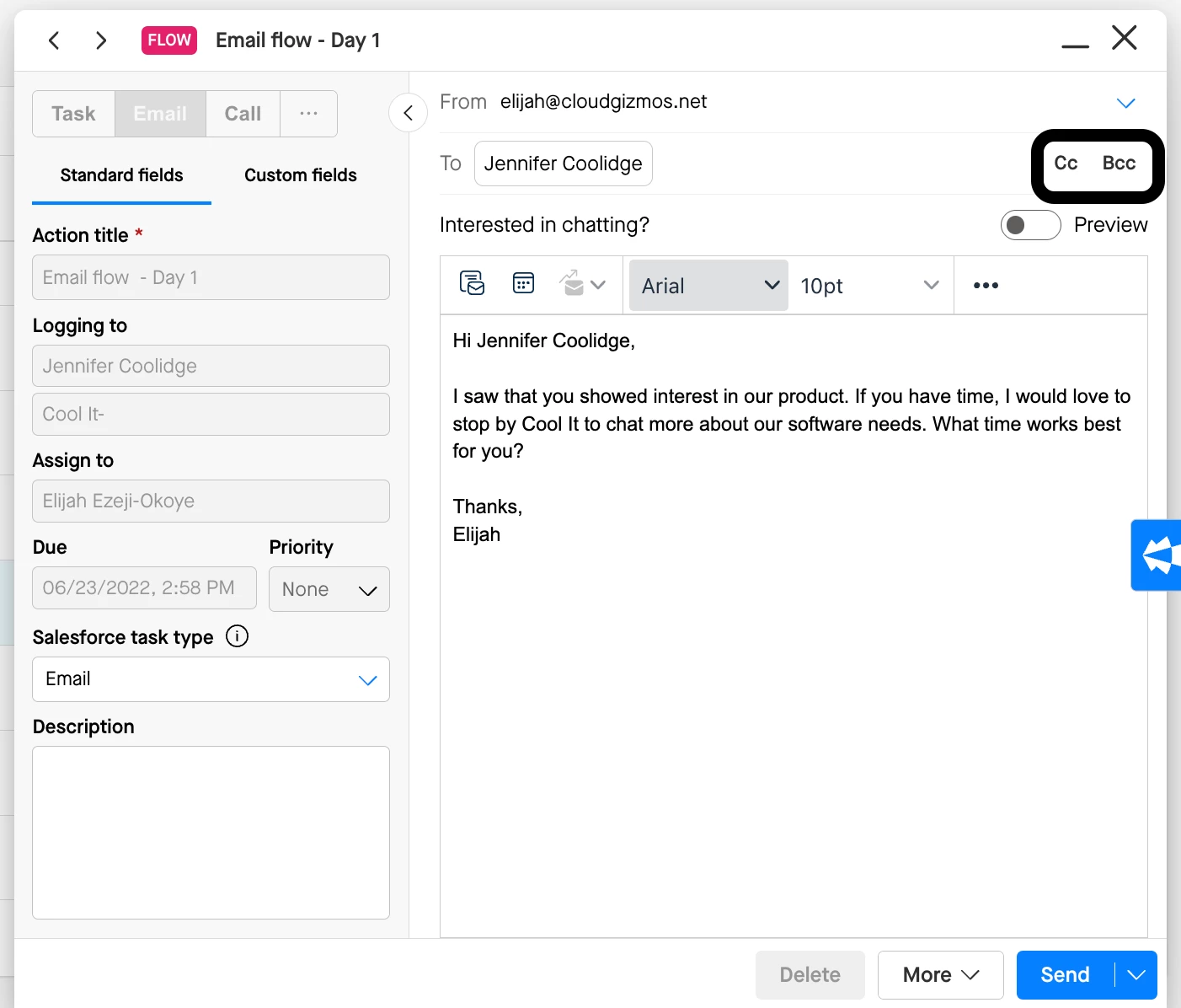 Q: Is there a way to automatically CC an internal team member on every email in a flow?