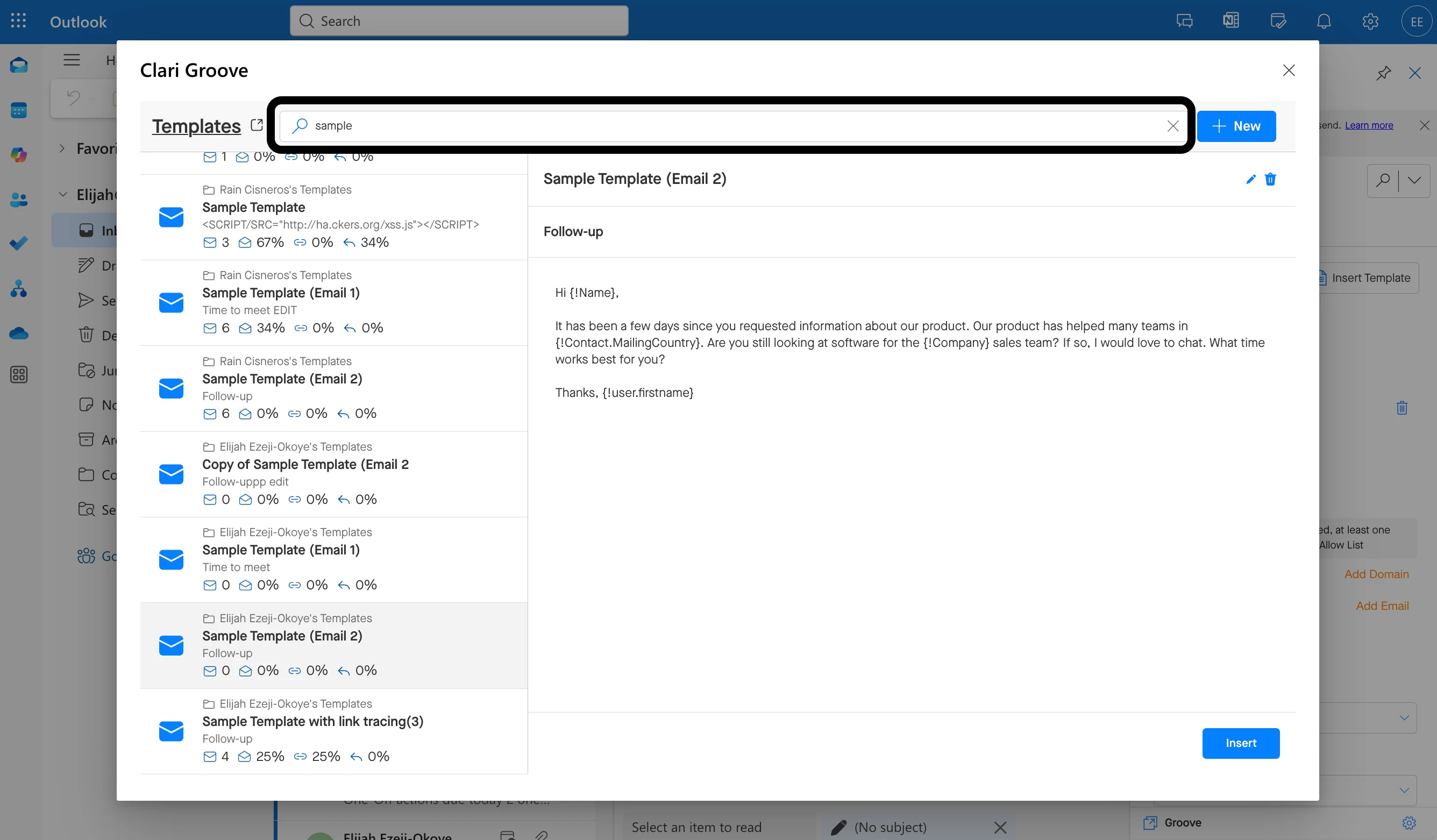 - The search bar at the top of the Template modal enables you to search your Template library for a specific Template by Template Folder name, Template name, or subject line.