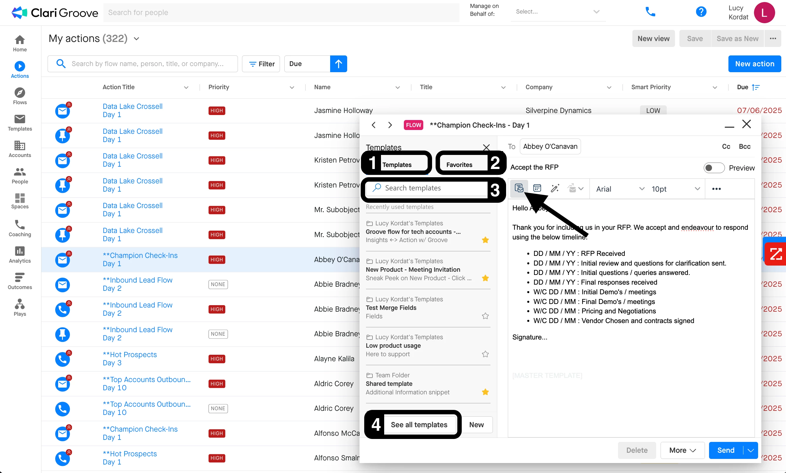 When writing Flow and one-off Actions emails in the Action Compose window (both G-Suite and Microsoft users), you can look among your recently-used Templates and favorited Templates to find the Template you want to use for their email. You can also search for a Template by Template Folder name, Template name, or subject line.