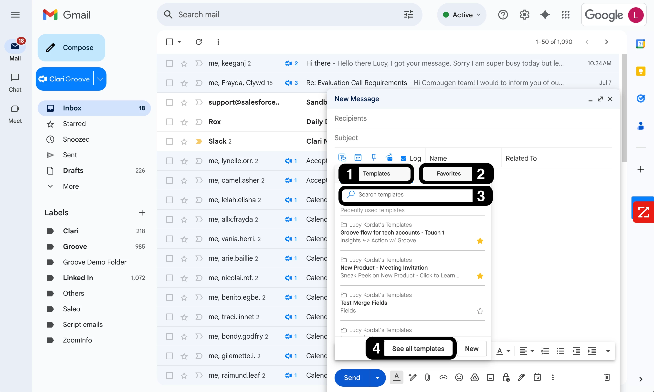When writing emails in Gmail, you can look among your recently-used Templates and favorited Templates to find the Template you want to use for their email. You can also search for a Template by Template Folder name, Template name, or subject line.
