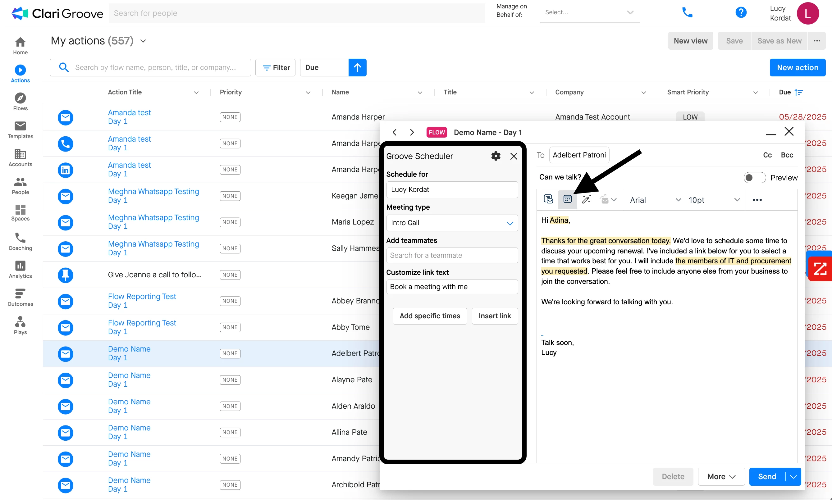 You can also manually insert your Groove Scheduler Link into, as well as use the Add Specific Times feature with, any Groove Flows or Actions emails. This enables you the flexibility to quickly include your Scheduler link on individual, non-templated emails to make booking a meeting a breeze.