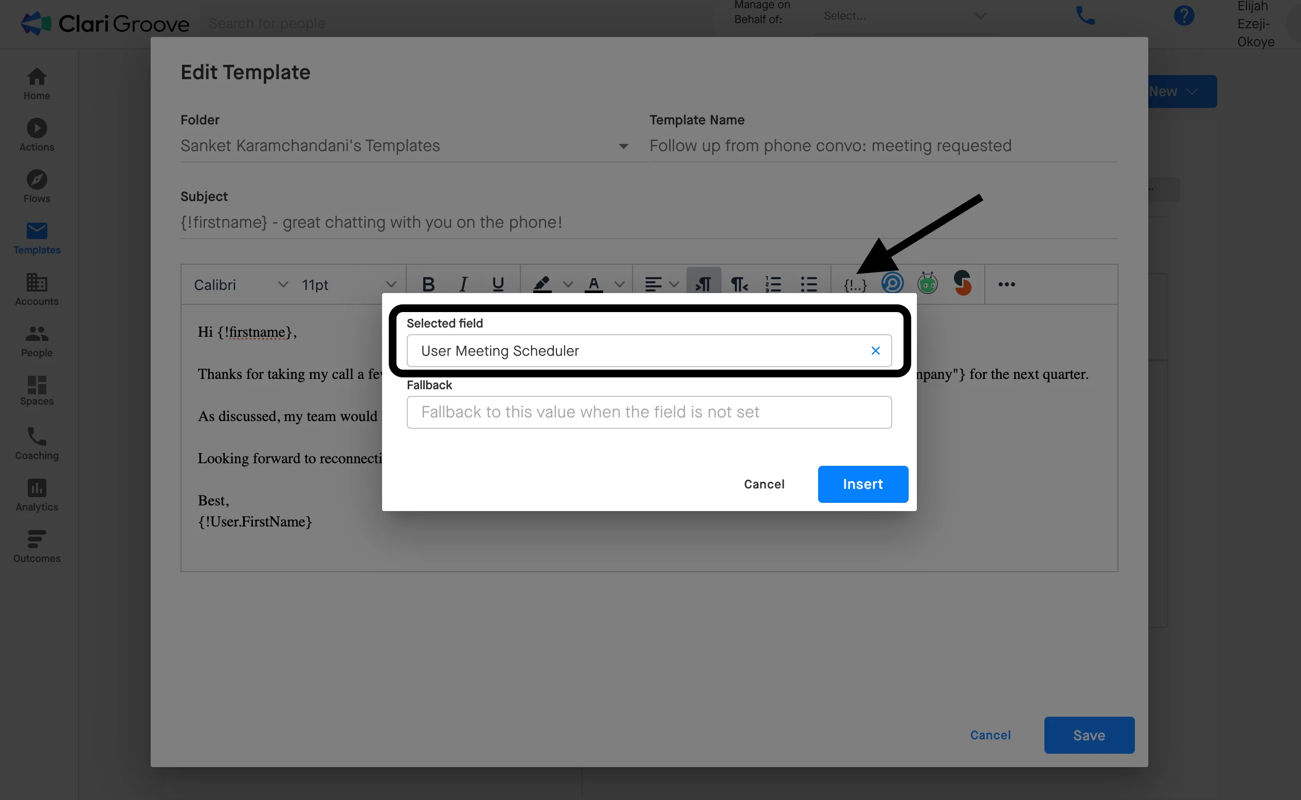 To automatically insert a the sending user’s Groove Scheduler Link into Templates, you can use the Groove Scheduler Link merge field. (Note that the Scheduler Link Merge field is based on a custom field in your team’s Salesforce instance. Thus, the exact name of the field may differ from organization to organization.) This merge field is a great way to personalize emails at scale, as it enables users to leverage the same Templates without having to do any manual work to insert their own Scheduler link in the Template.