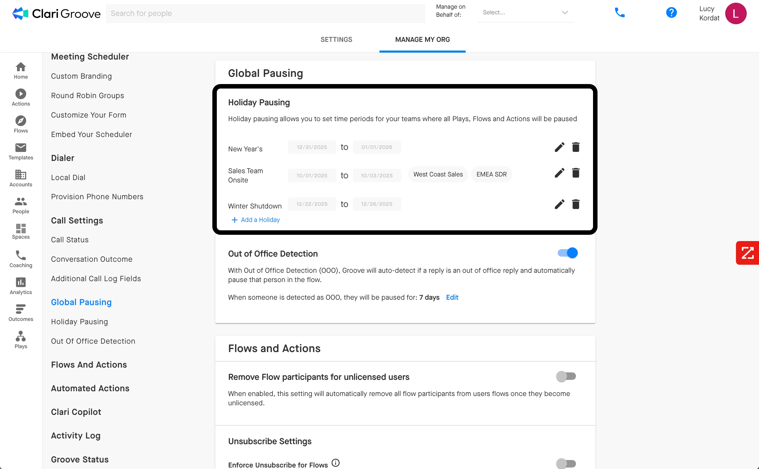 For organization-wide holidays, admins can configure global pauses that apply to larger groups of users from Manage My Org > Global Pausing > Holiday Pausing. This ensures no Groove Actions become due while users are off. These holiday pauses can be configured to apply to specific Groove Teams or to all users at the organization. More information on Holiday Pausing can be found in this guide.