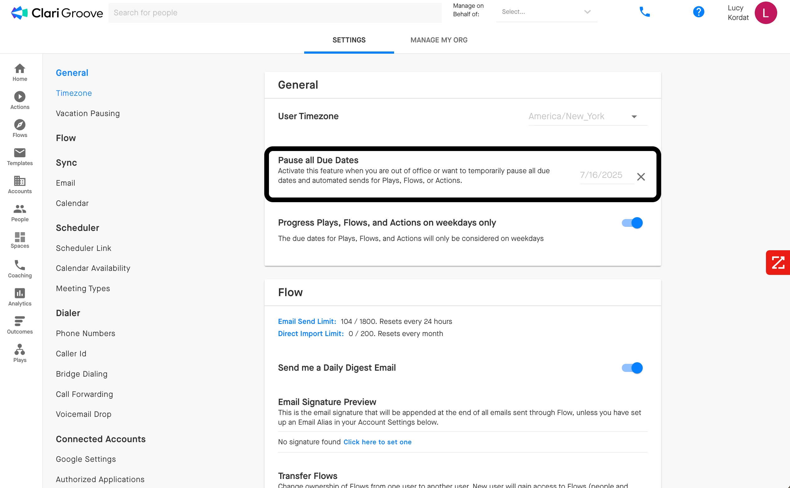 For an individual’s absence, users can activate the Pause All Due Dates feature in Groove Settings > General > Vacation Pausing. This type of pause will only pause the Flows and Actions that they manage, without impacting any other users at the organization. More information on individual pausing can be found in this guide.