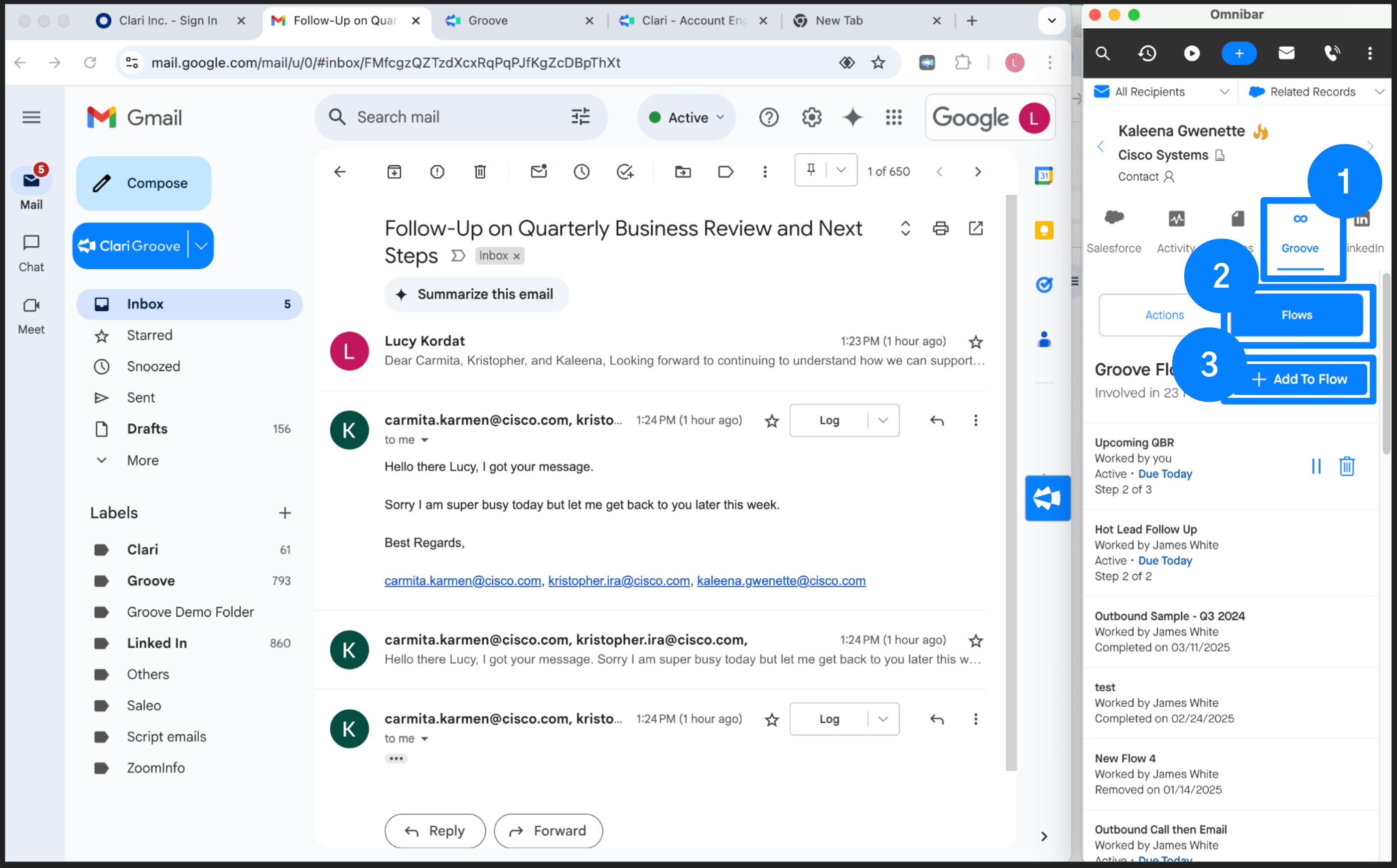 The quickest method to add someone to a Flow from an inbound email is to select the Add to Flow action directly from the inbound email. When you open an email, you can easily access someone’s Salesforce contact information via the Omnibar, and add them to the appropriate Flow directly from the Omnibar as well: