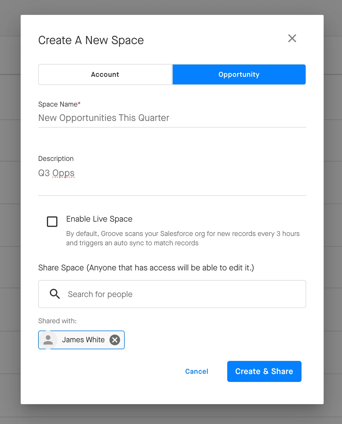 Choose from one of the options shown above. Then select Opportunity or Account, add a description, and search for the members of your team(s) who you want to collaborate with. Finally, Create & Share the Space.