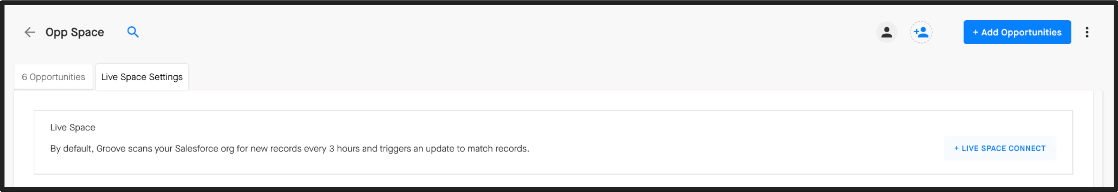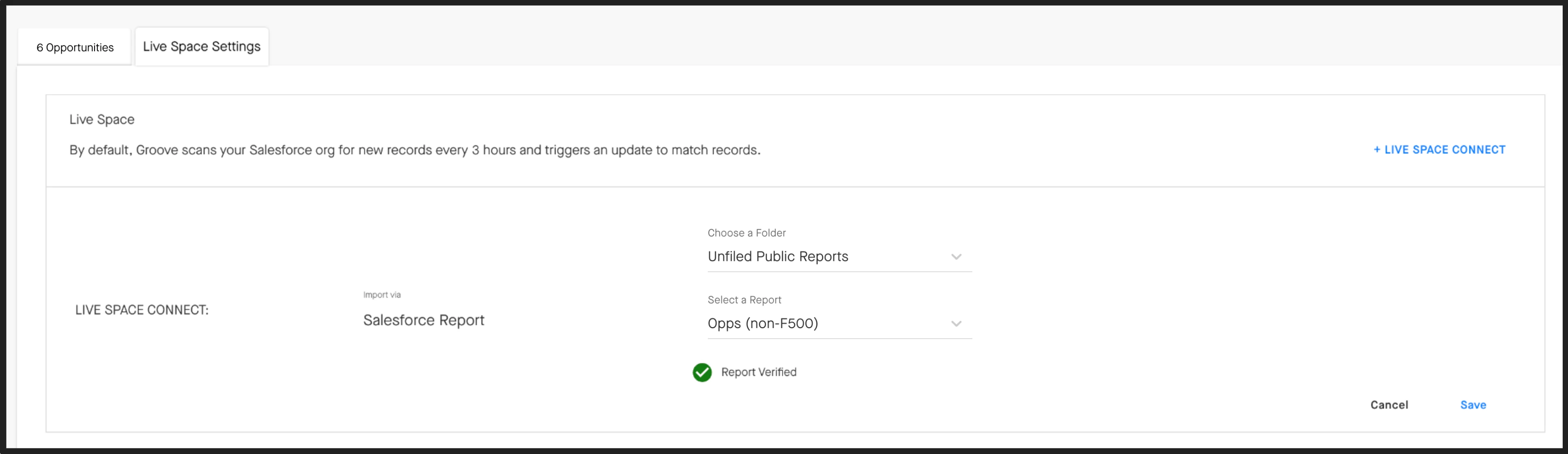 With a Live Space, you can connect your Space to a Salesforce report that will automatically import the Accounts/Opportunities in that report to your Space. Groove will also scan your Salesforce report for new records and update your Space to match. This also includes removing Accounts/Opportunities from the Space if they are no longer included in the SFDC report.