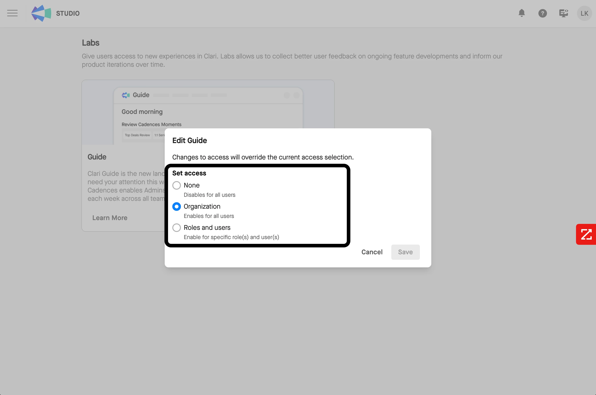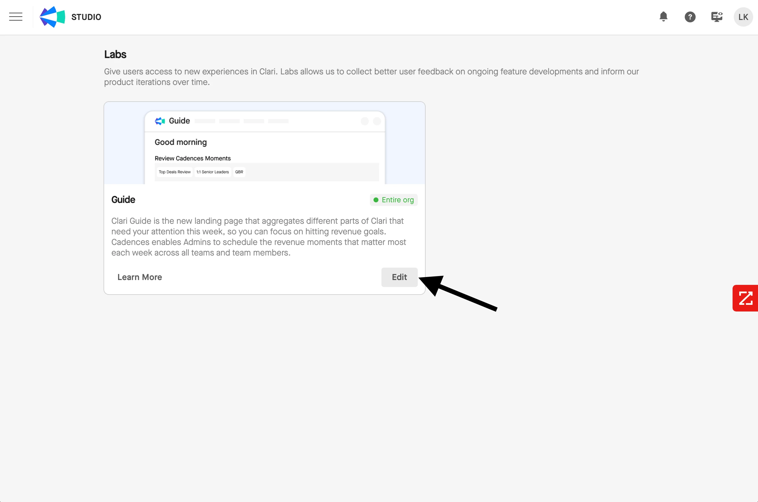 If you are an Advanced Ops Admin, you can enable Guide and Revenue Cadences in Clari from Clari Studio Labs, which is where you can share and launch the rollout of cutting-edge features for your team in a more controlled environment. Clari Studio Labs gives you granular control to ensures that your team can designate exactly which users are able to access certain features at a time.