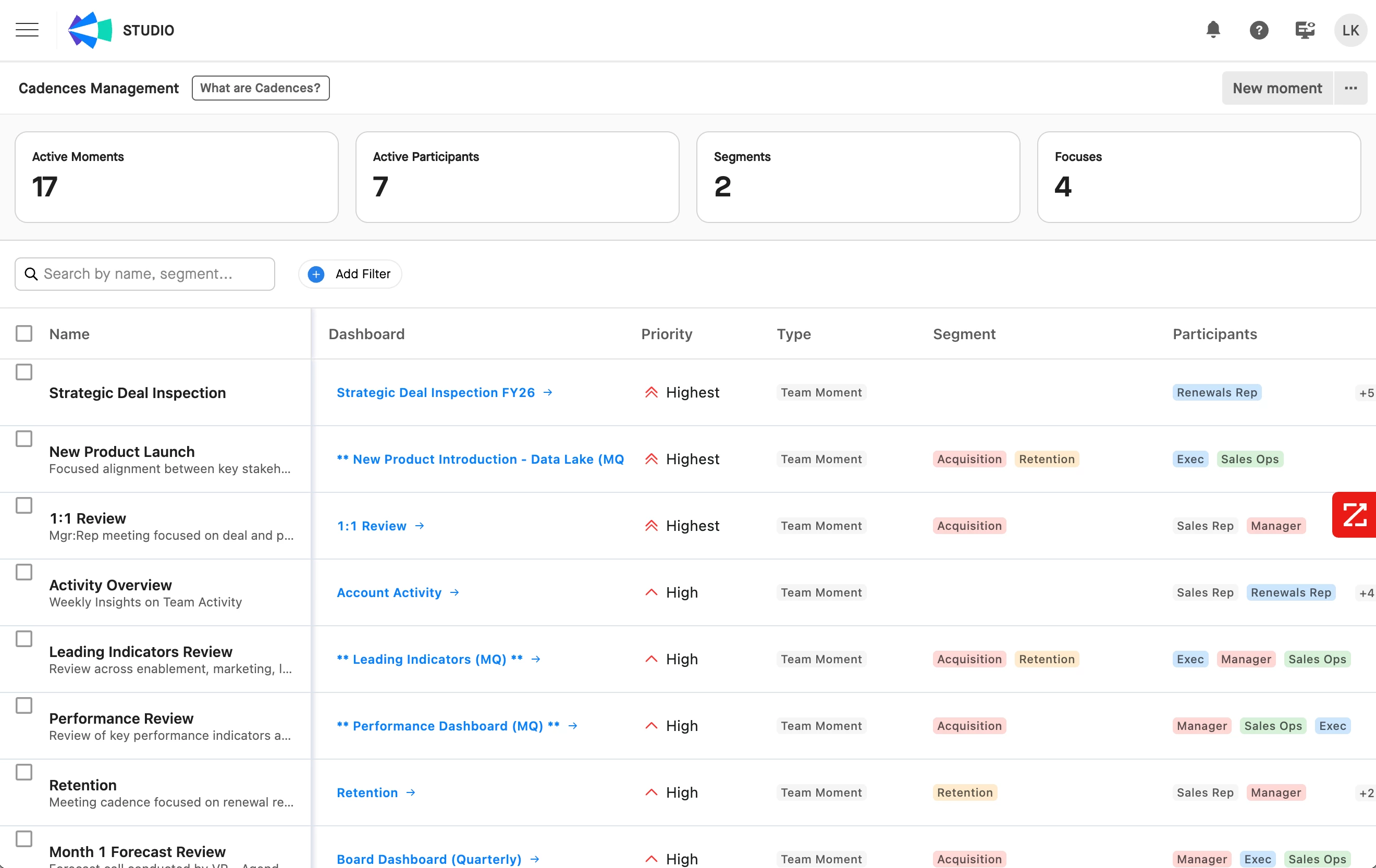 Once you’ve enabled Guide in Clari Studio Labs, you can manage your team’s Cadences from Clari Studio > Cadence Management. This is where you can build your Revenue Moments that will be assigned to Cadences.