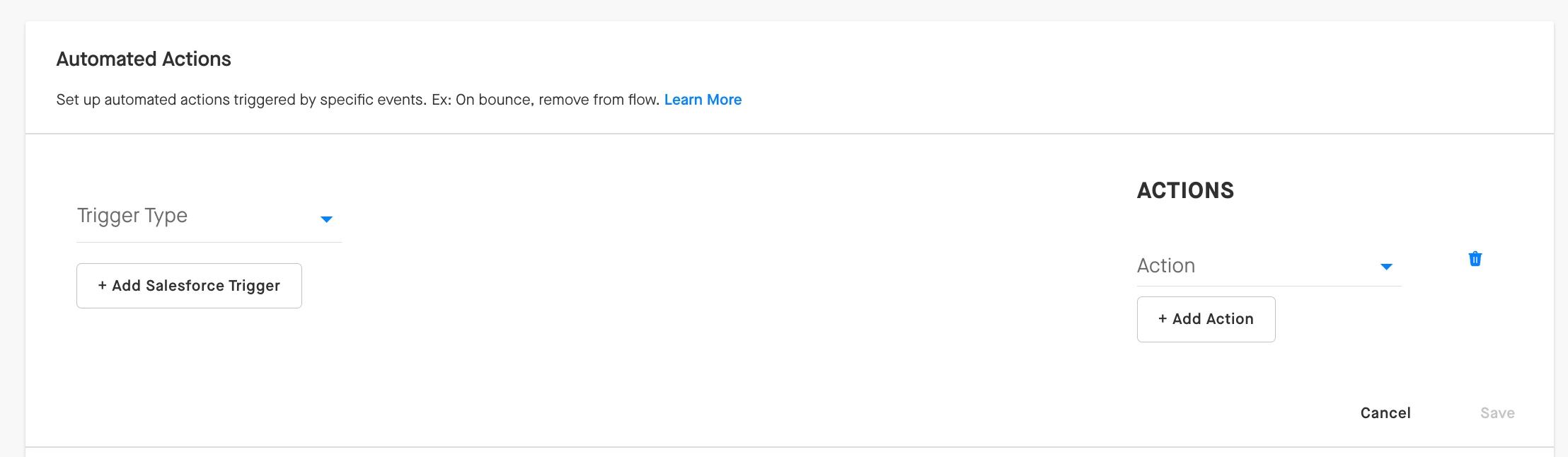 Users with edit access to a Flow have the option to set up Automated Actions for an individual Flow under the Flow Settings tab under Automated Actions for individual flows. Admins can set up Global Automated Actions that apply to all your organization’s Flows under the Automated Actions section of Manage My Org.