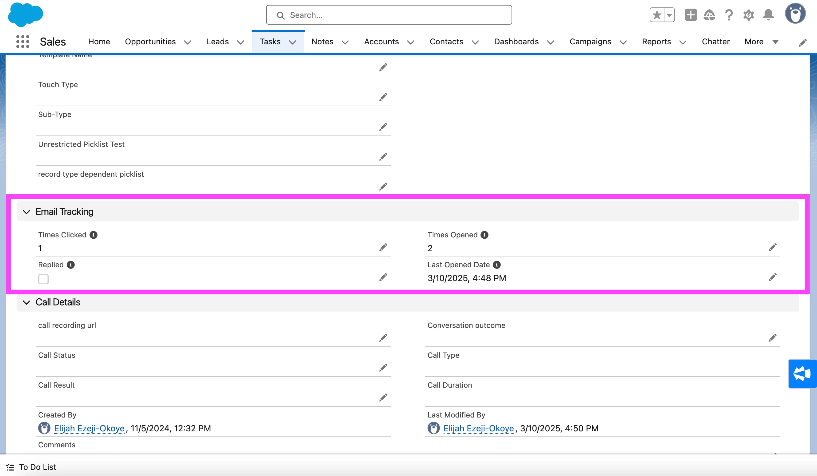 Note: If you don’t see these fields on the Salesforce Task record itself, they may not be added to your team’s Task Page Layout yet. Your team’s Salesforce admin can adjust the Task Page Layout to surface these fields where they make the most sense for your team.