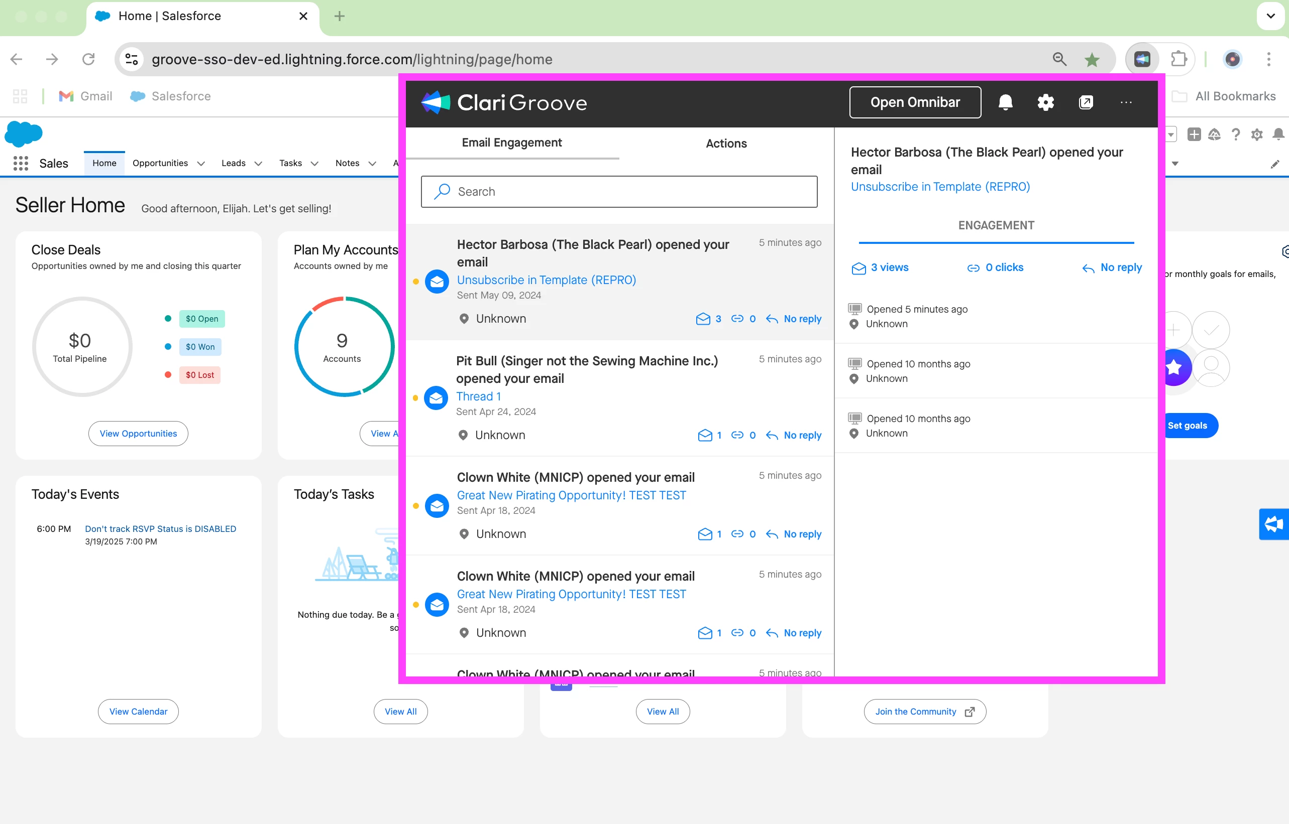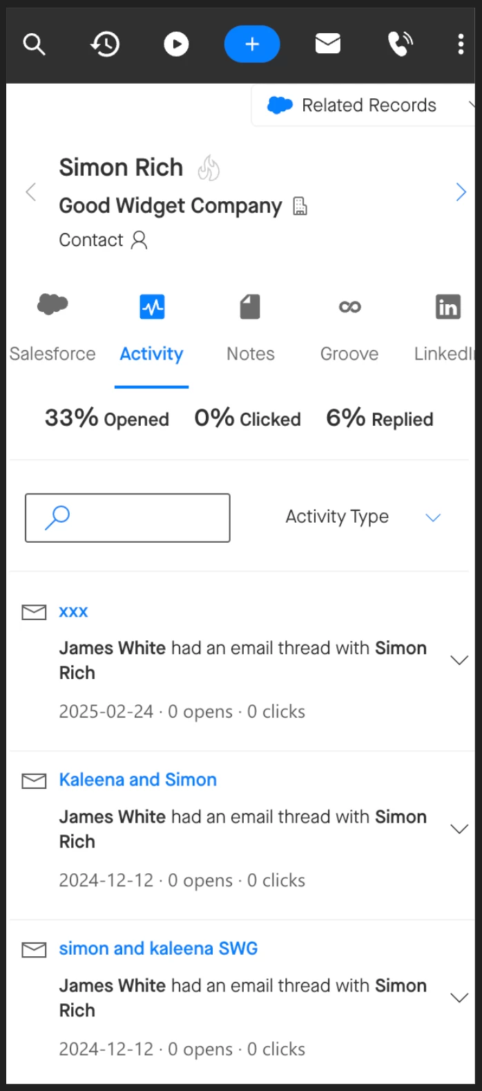 The Omnibar meets you where you’re working. Whether you’re in your inbox or the Groove web application, just as a few examples, the Activity tab will allow you to see past email opens, clicks, and replies associated with an account or contact.