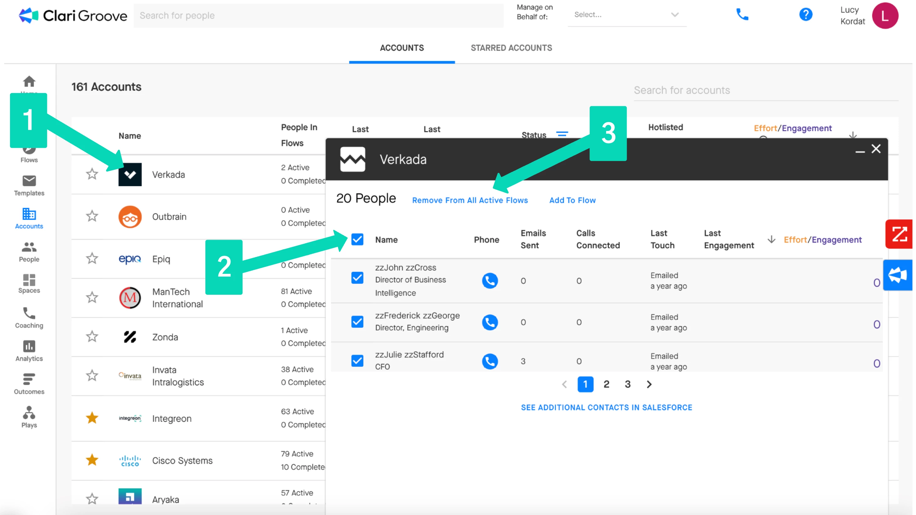 - The metrics under the ‘People in Flows’ column for the Account will not change after you complete the removal. The ‘Active’ count includes the total number of Flows that Contacts at the Account are currently active in plus the total number of Flows that Contacts at the Account have been removed from prior to them completing the Flow. The ‘Completed’ count is just the total number of Flows that Contacts at the Account have completed in their entirety.