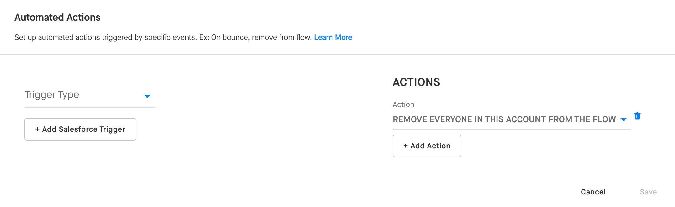 The last way to remove all Contacts at an Account from a Flow would be by setting up an Automated Action. Automated Actions listen for certain triggers (or criteria) to be fulfilled across your instance. When a trigger criteria is satisfied, Groove will fire the corresponding action.