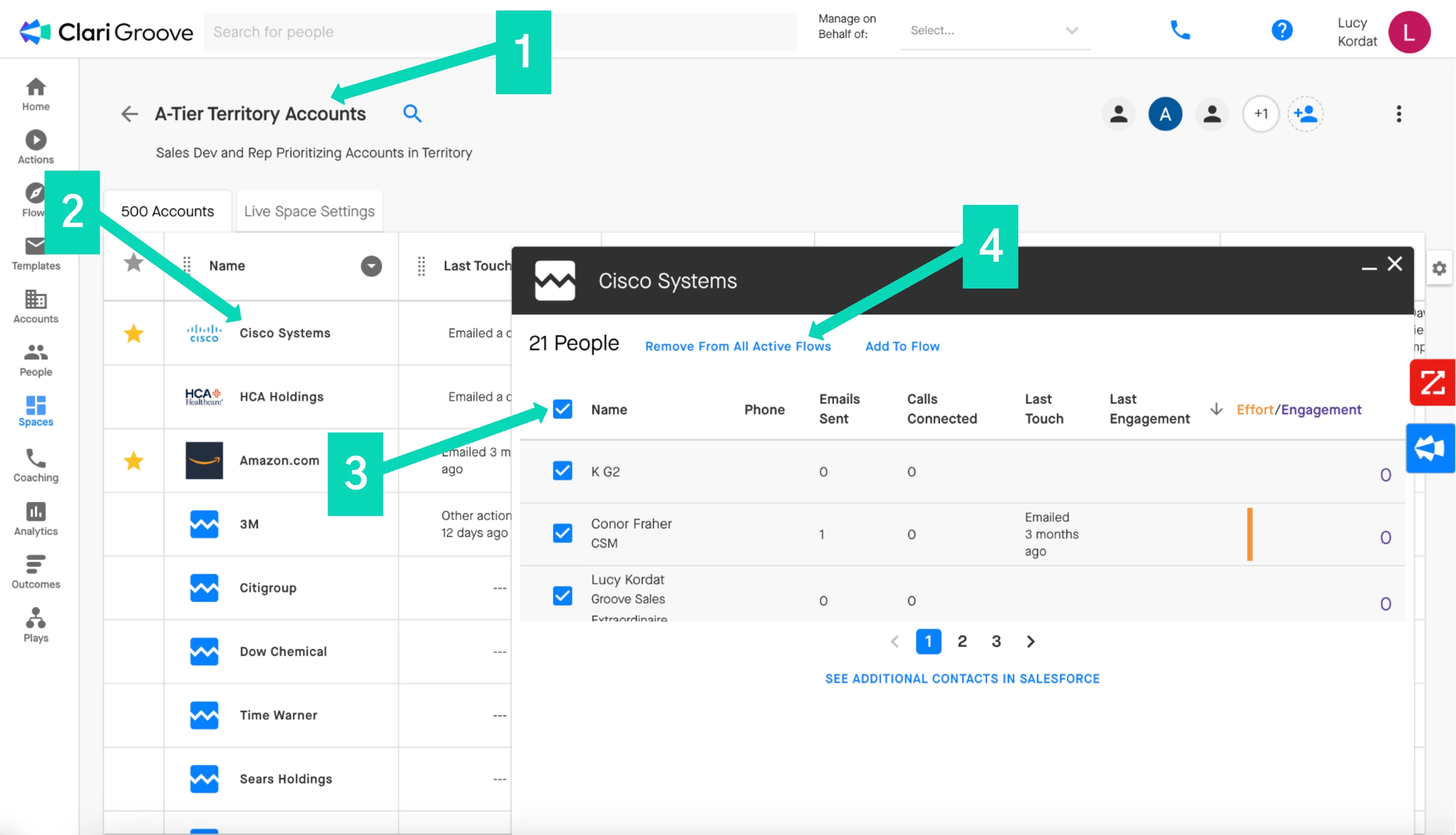 One of the actions Groove can trigger is the ‘Remove Everyone in This Account from This Flow’ action. With this action, when the trigger criteria is satisfied by one Contact that is active in the Flow, that Contact and all other Contacts attached to the same Salesforce account will be removed from the Flow. A list of triggers that can be paired with this automated action can be found here.