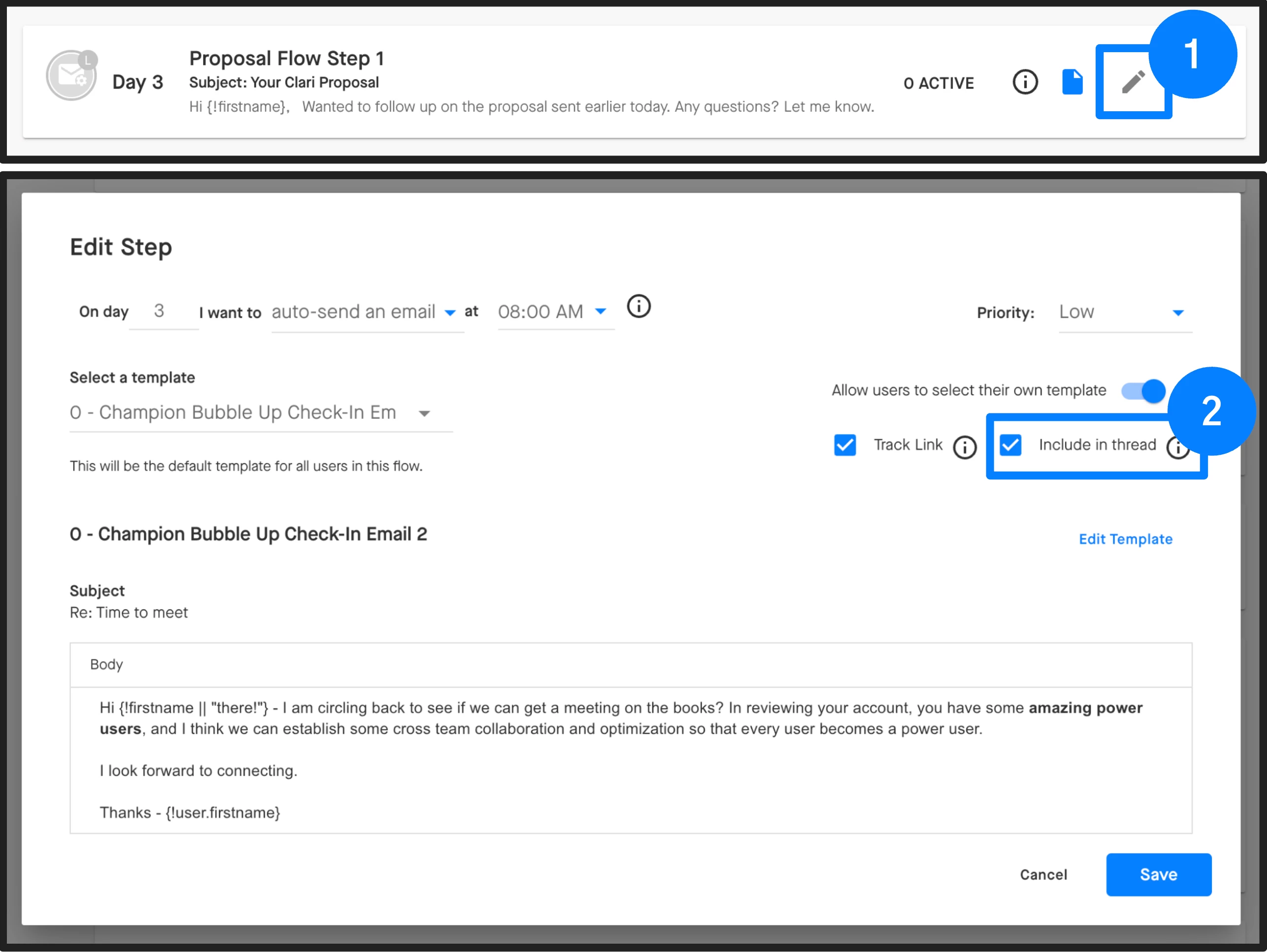 Note: The Include in Thread checkbox won’t appear on the first email in a Flow since there’s no prior email to thread onto, but it will be available for all subsequent steps.