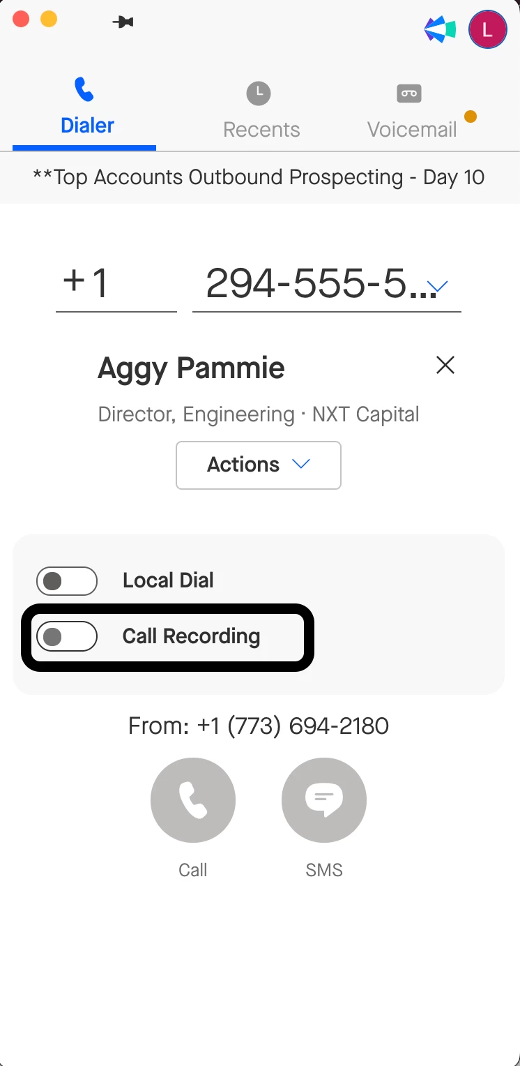 - Enable Optional Call Reording: The user will have the option to record calls through the OmniDialer. The call recording toggle in the OmniDialer will default to being turned off, but users can flip this toggle on on a call-by-call basis to record the calls they want recorded.