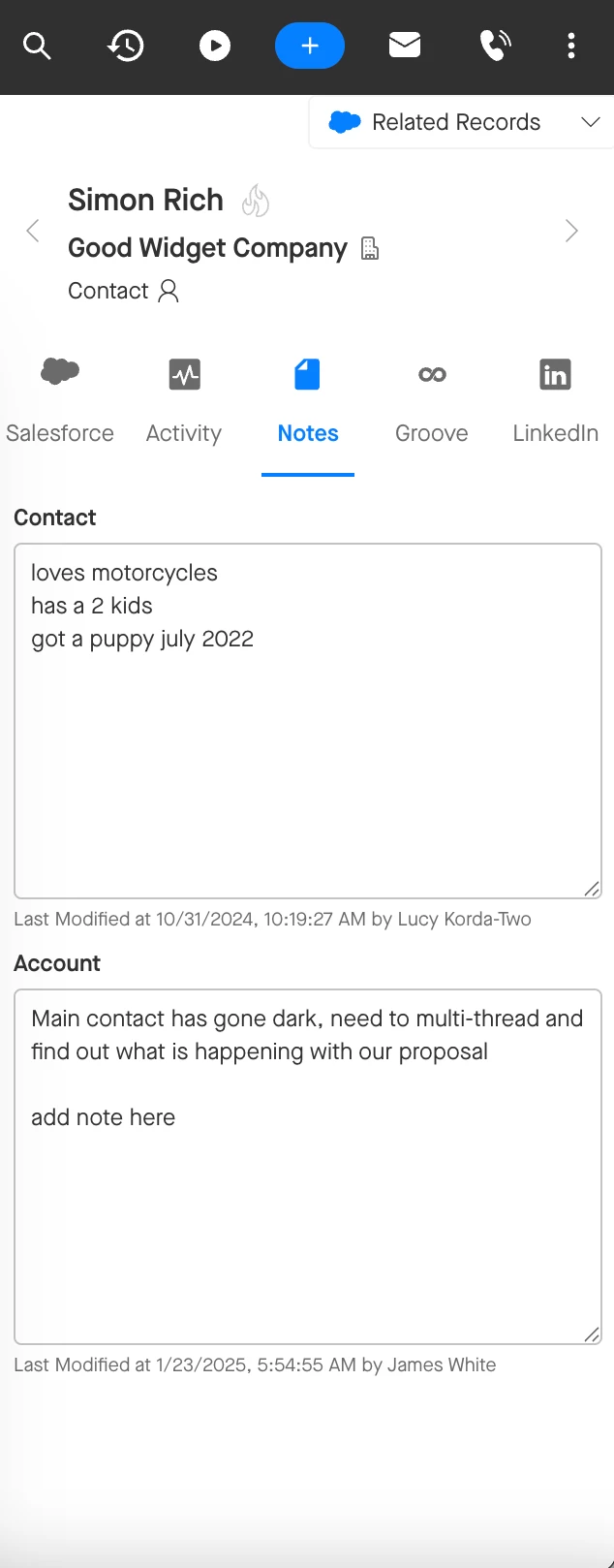 The Groove Notes field in the Omnibar mirrors exactly what is in the Groove Notes field Salesforce. You do not need to delete your previous notes where you see them in the Omnibar in order to add new or additional notes. Simply add your notes, and what you added in the Omnibar will sync to Salesforce!