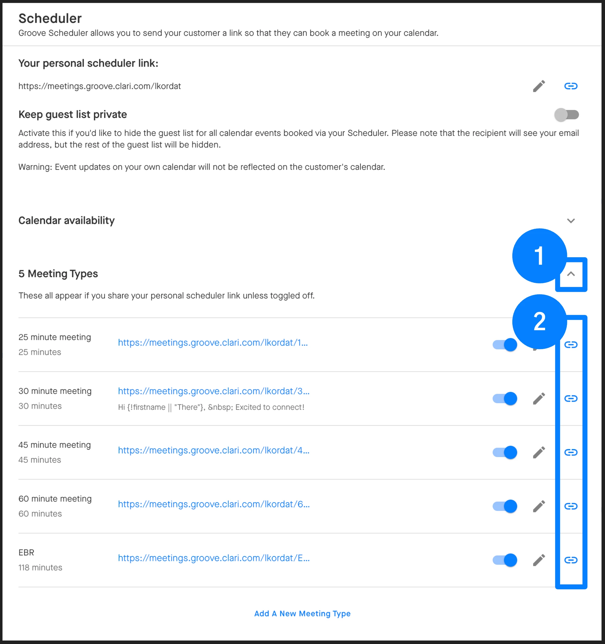 Select a meeting type (e.g. 30 minutes) from the out-of-the-box options or a customized option that you have set up, and copy the scheduler link by clicking the chainlink icon beside it. Now, you can easily add the link to an individual email, or one of your email templates so that it’s always there.