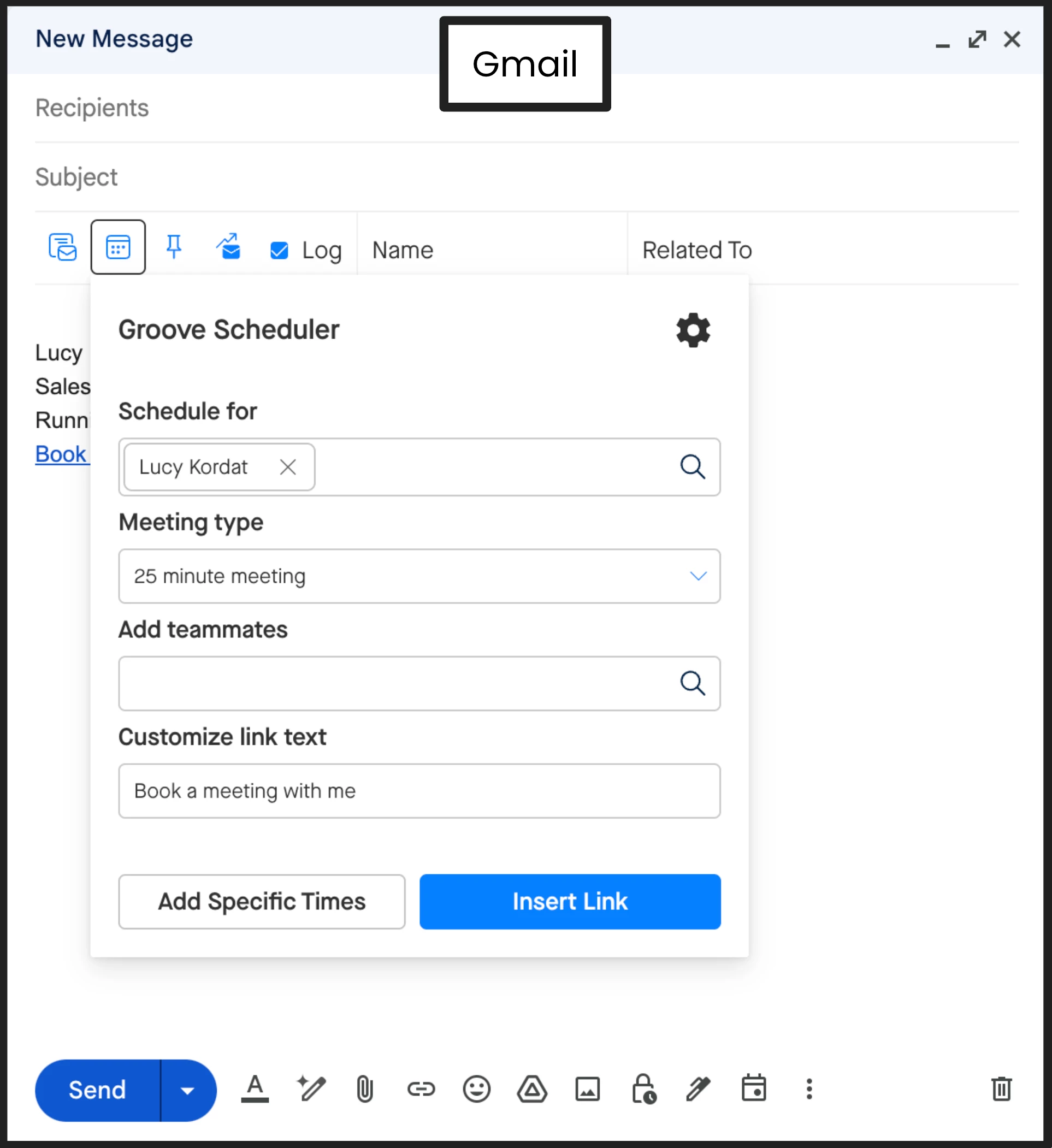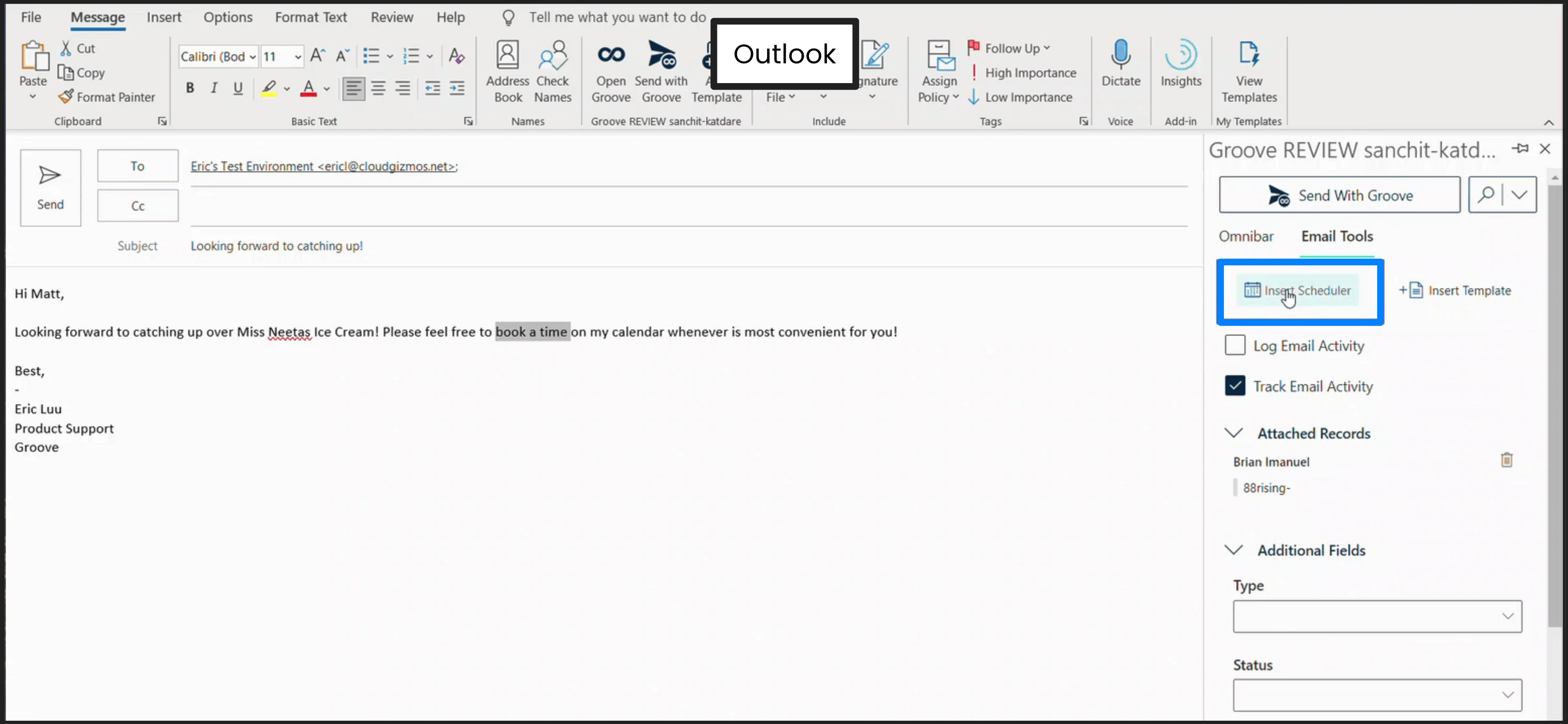 In Outlook, you can pin the Groove extension on the right side of your inbox, where you can insert the scheduler from the Email Tools section.