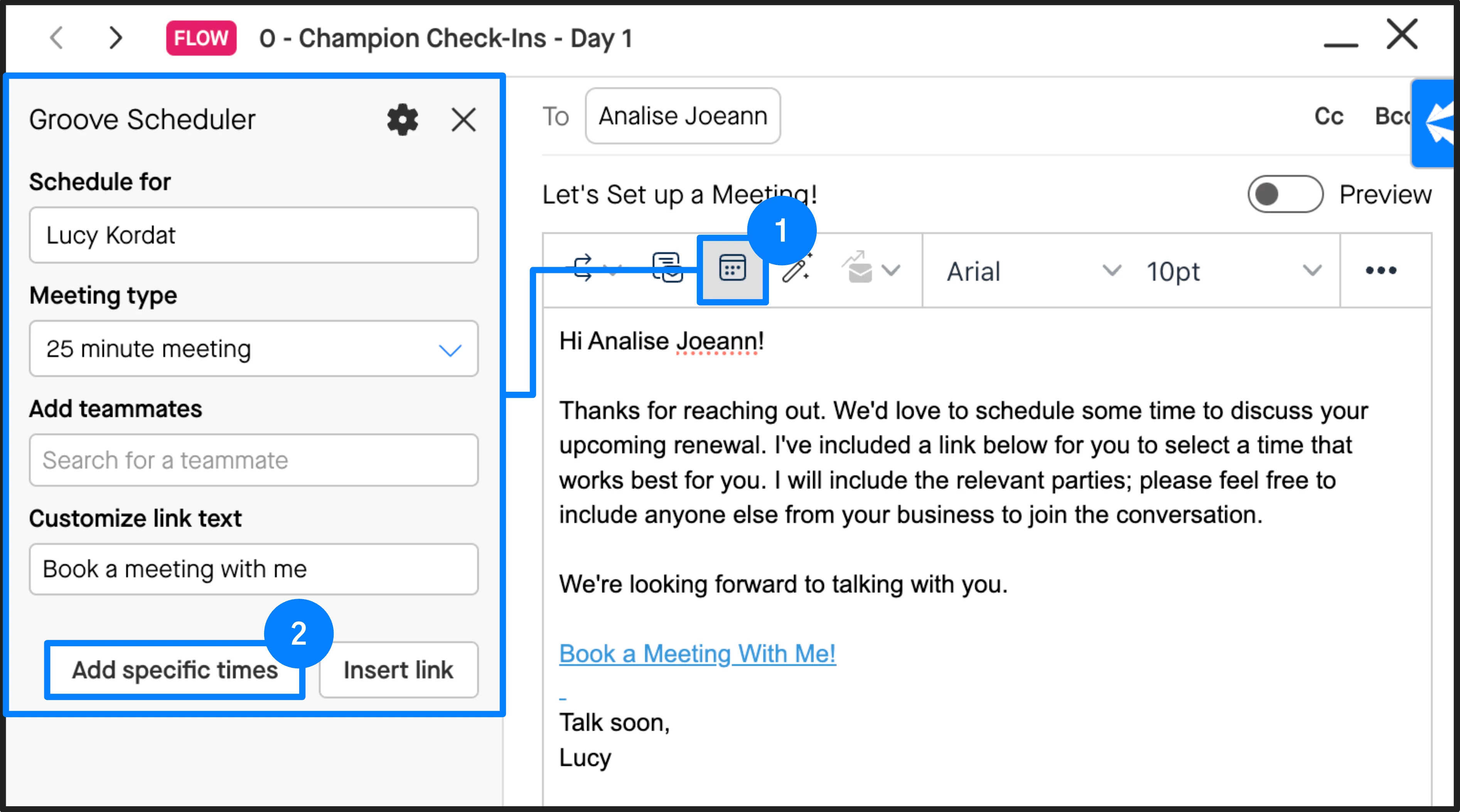 Additionally, you can insert specific times within a flow step. Just like in the inbox experience, you can now include specific times in any Groove Flow email step.