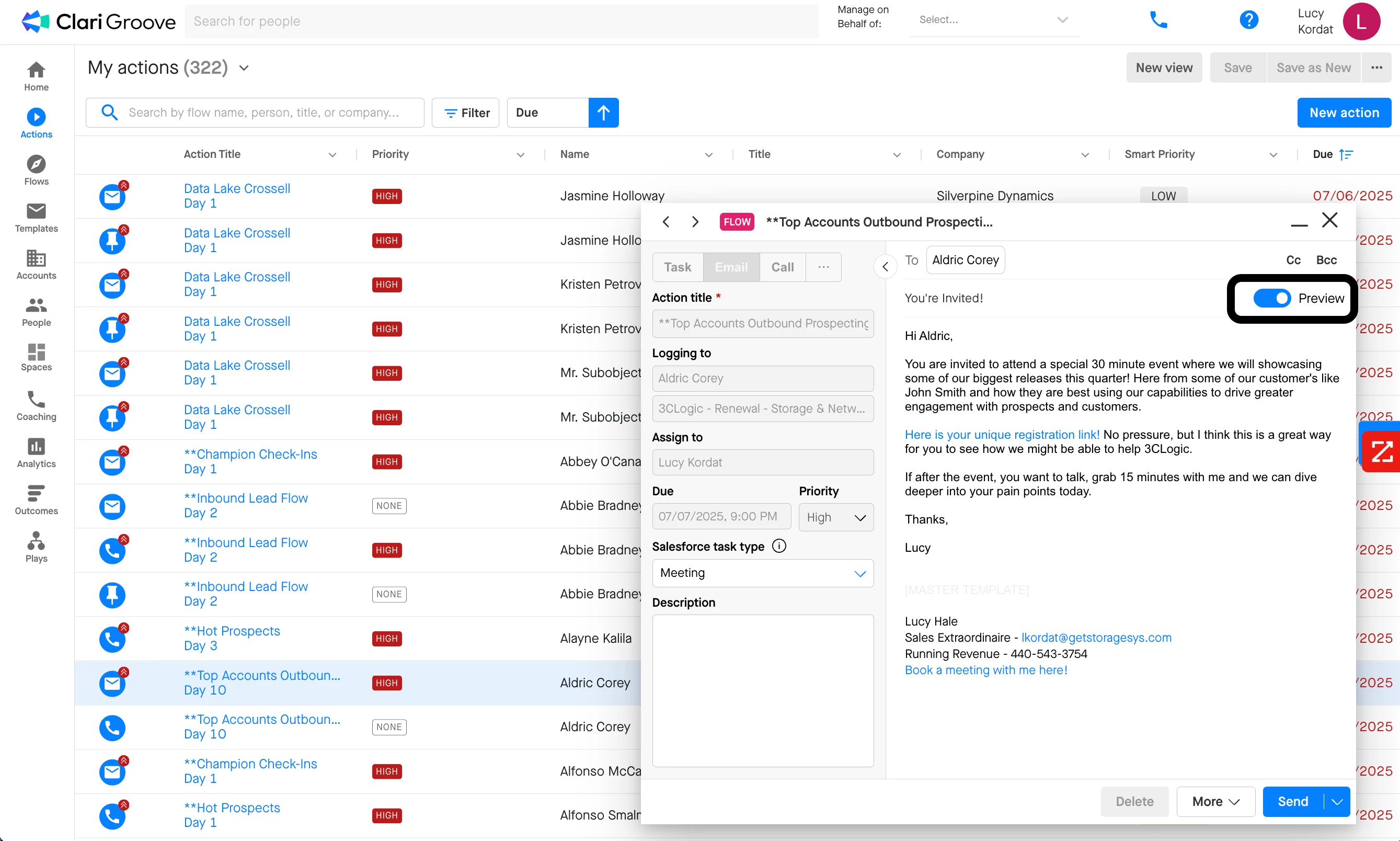 2. In the Action Compose window, turn the ‘Preview’ toggle on to see what your email looks like within the Action Compose window itself. If you are using an email signature or unsubscribe footer, these should be applied when the ‘Preview’ toggle is turned on.