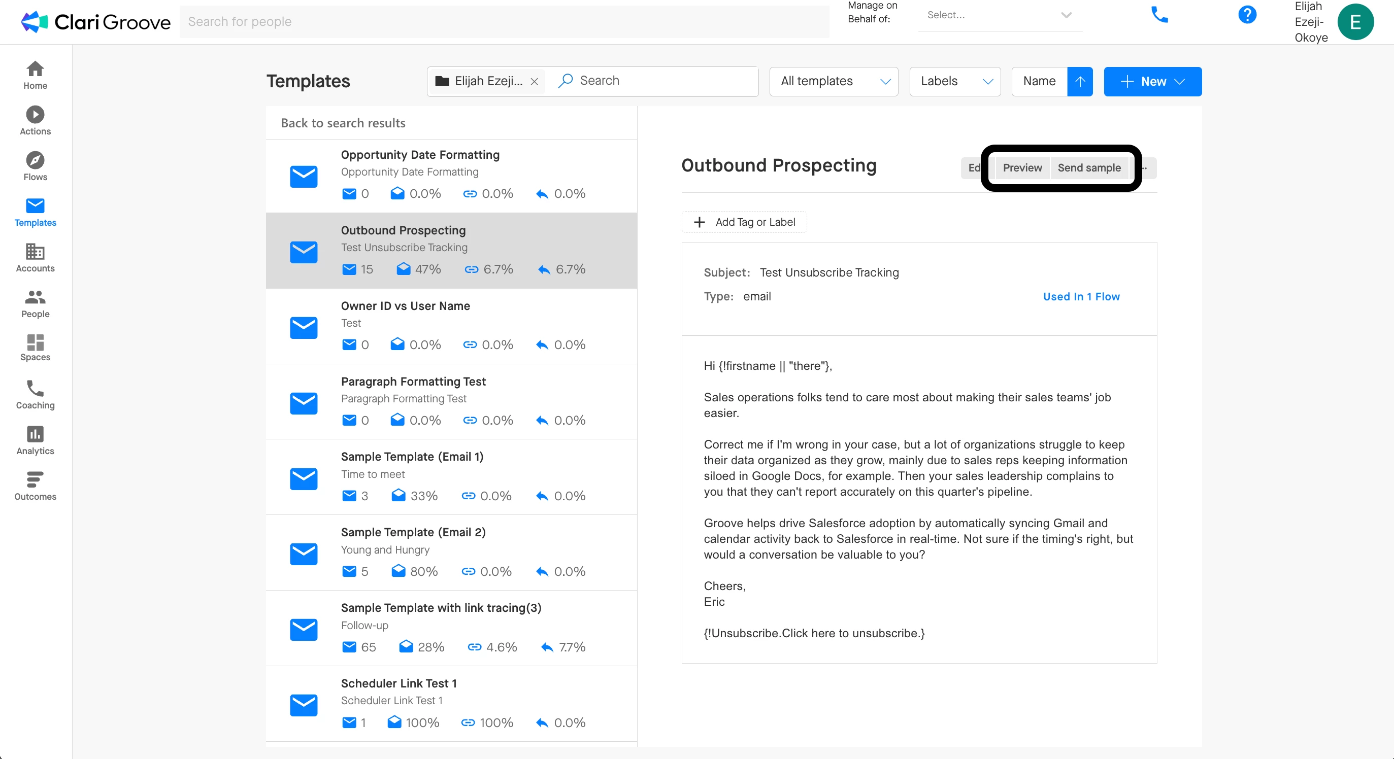 1. In the Groove Templates page, press the ‘Preview’ or ‘Send Sample’ icon to have a copy of the email Template sent to your Groove email address. The ‘Preview’ button will enable you to choose a Contact or Lead to preview the Template with so that you can see what any merge fields in the Template look like when they’re resolved. This will enable you to review what your Template looks like to a recipient. (Note that email signatures and unsubscribe footers will not be appended to the sent sample emails.)