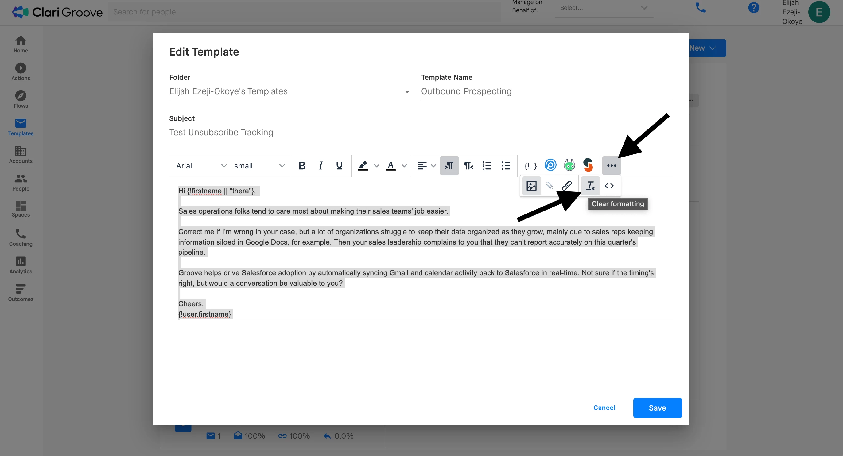 To avoid formatting issues, apply styles exclusively using the formatting tools within the Groove Template editor. This will help ensure no messy formatting or extra styling information is carried over from the first text editor, which could alter how the text appears when it’s sent in an email.