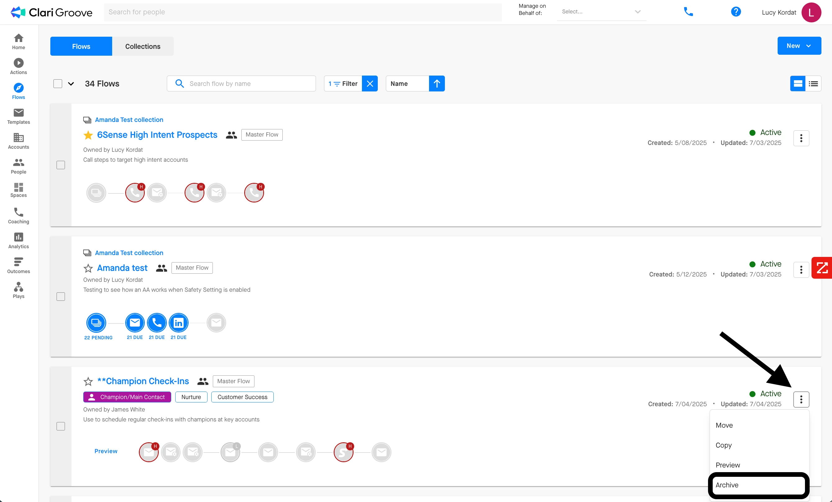 - The first is from the main Flows page, where you can see the list of Flows that match your current filtering criteria. To archive a Flow from here, click the three vertical dots in the upper-right corner of the Flow card, then select ‘Archive’ from the dropdown menu.