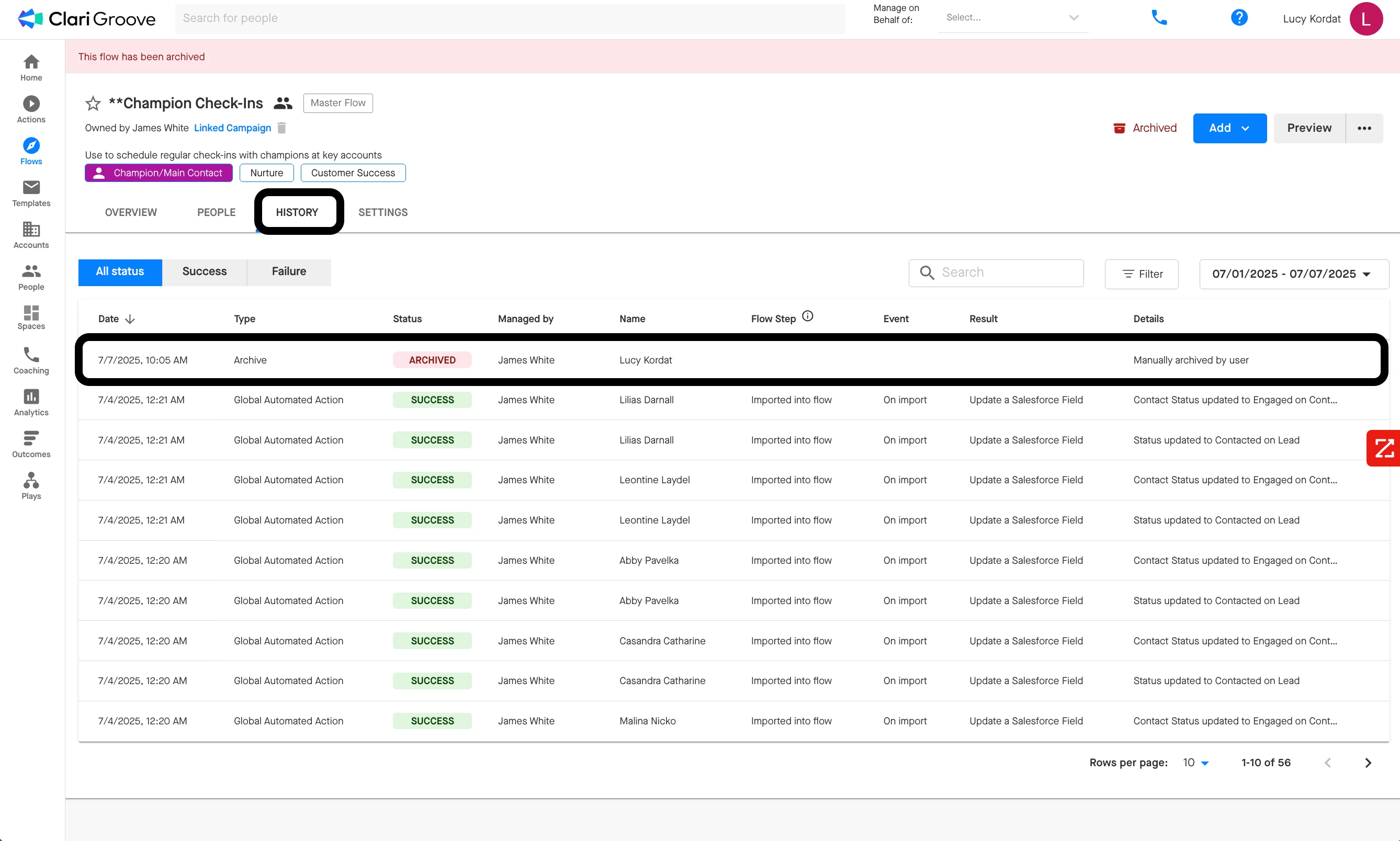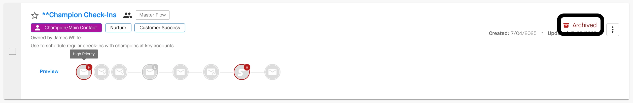 - Status Change: The Flow’s status will change from ‘Active’ to ‘Archived’. While a Flow is archived, no new participants can be added to the Flow and the Flow cannot be archived.