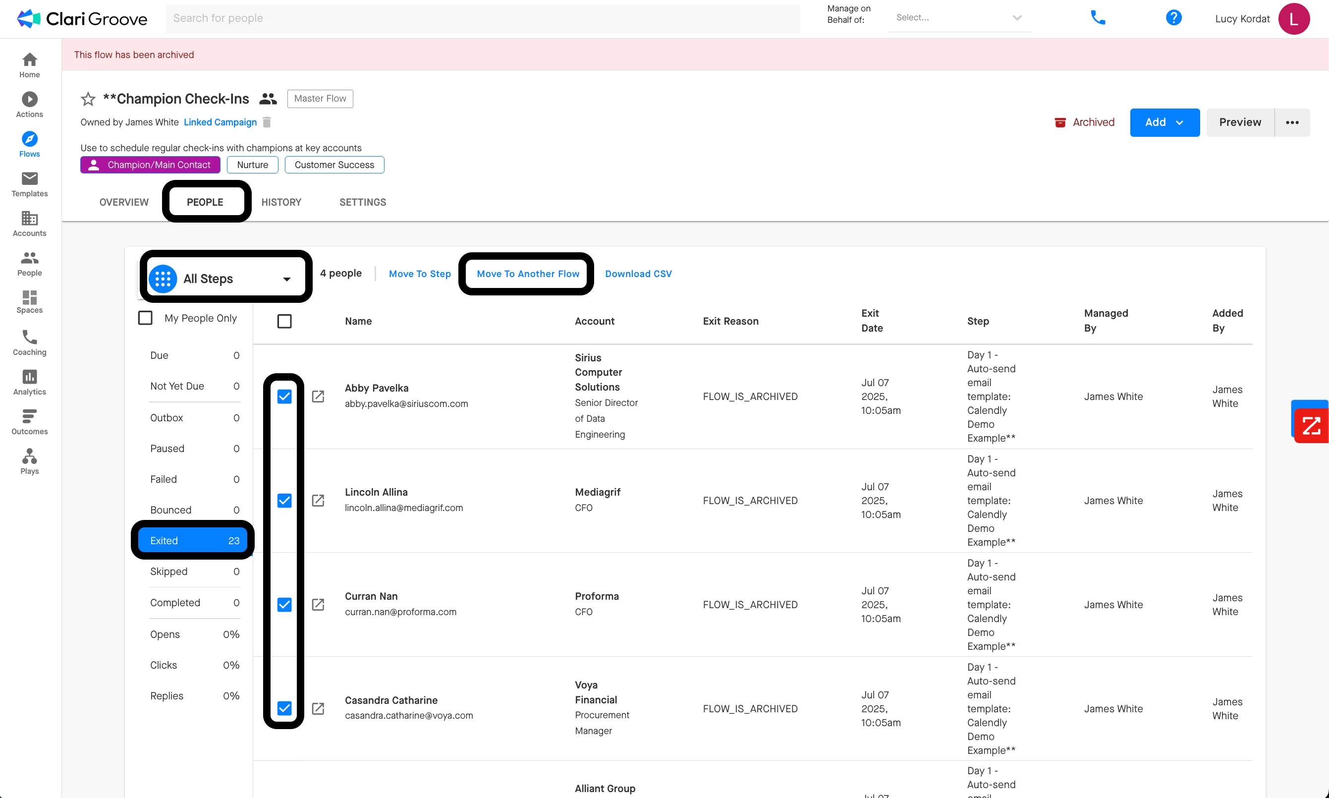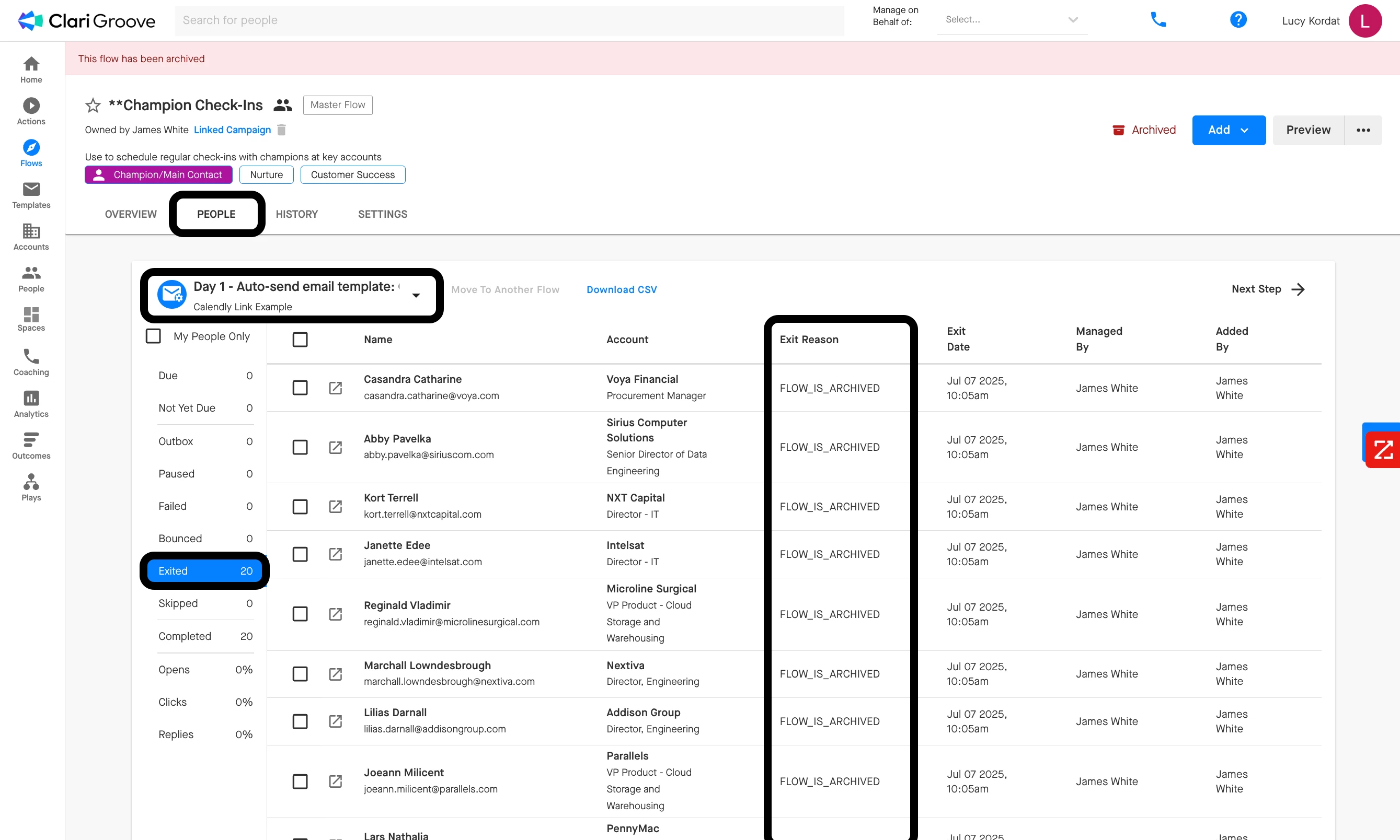 Though all of the active participants in a Flow are removed from it when a Flow is archived, they will continue to show up in the ‘People’ tab of the Flow. Those that were removed as a part of the archiving of the Flow will appear in the ‘Exited’ section with the Exit Reason FLOW_IS_ARCHIVED. Any participants who exited the Flow prior to the Flow being archived will continue to show in the ‘Exited’ section of the last Flow step they completed with their original Exit Reason. Those participants who completed steps in the Flow will continue to show up in the ‘Completed’ section of those steps.