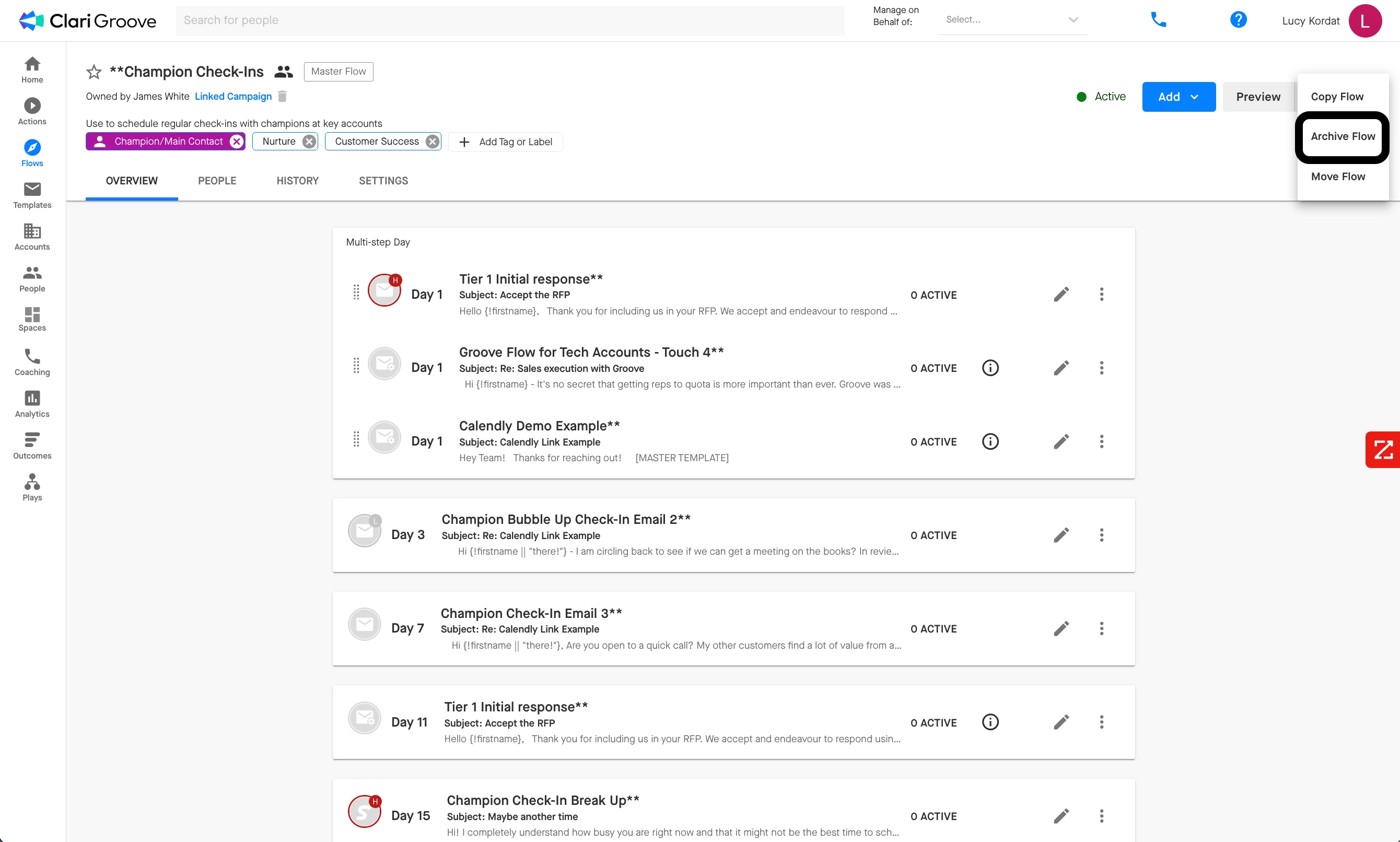 While a Flow is archived, you can review all the important Flow metrics and statistics – such as email open rates, reply rates, etc.) from within the Flow ‘People’ tab or from within Groove Analytics and Groove Outcomes.