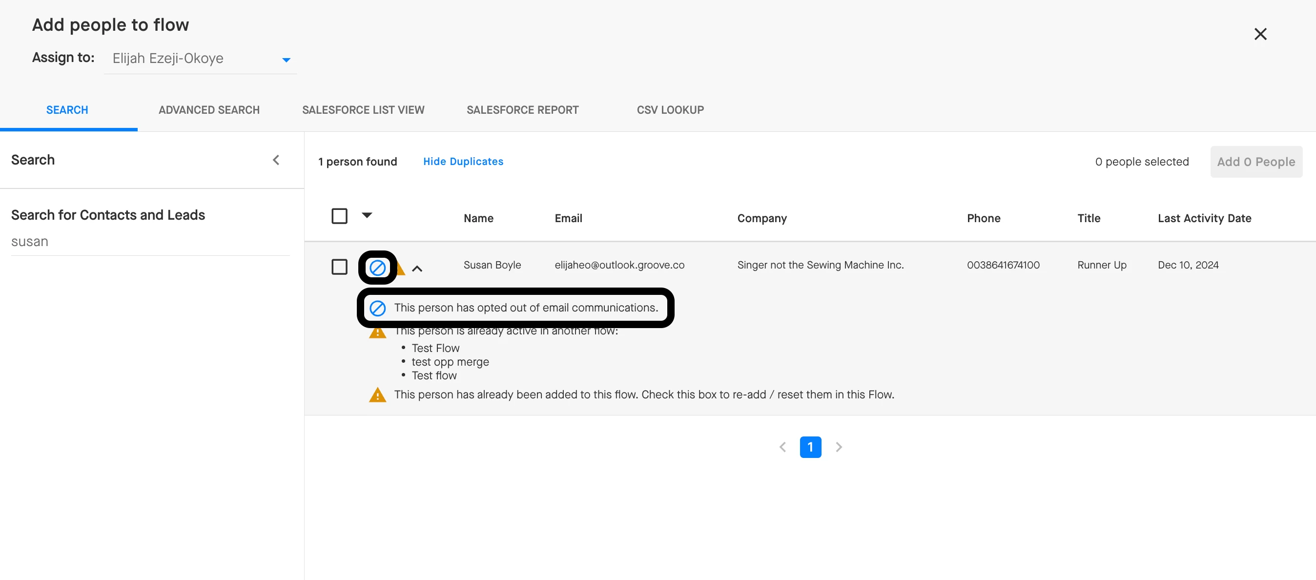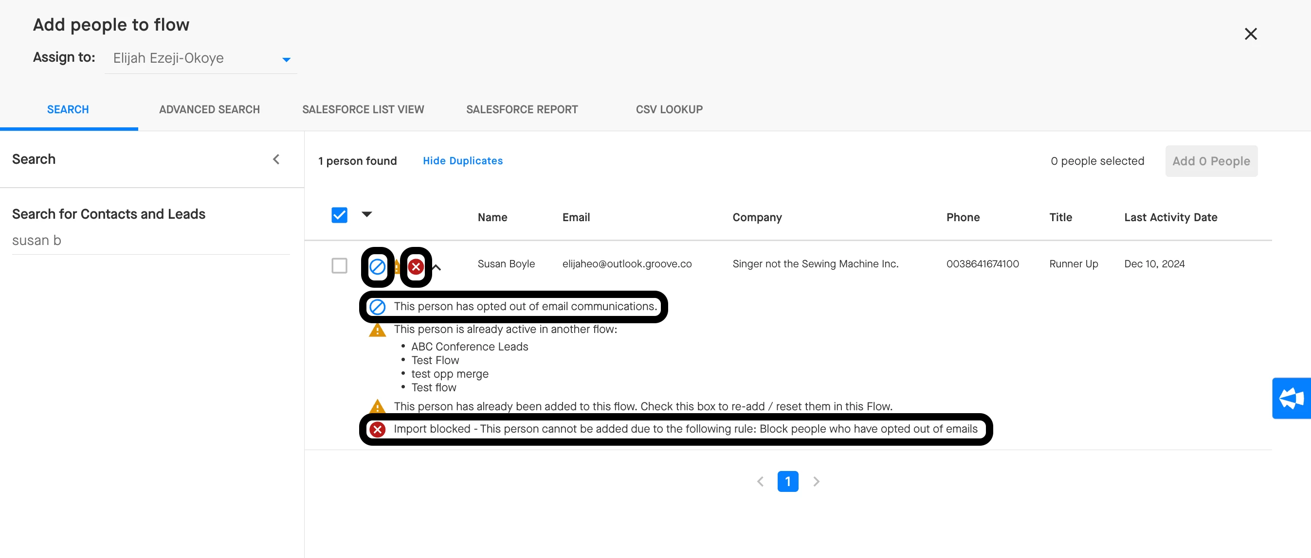 1. When you add people to a Flow, Groove will flag any Contacts and Leads who have opted out of email communications with a blue circle with a slash through it by default. This warning lets you know of their email opt out status so that you can decide whether you want to continue with importing them into the Flow.