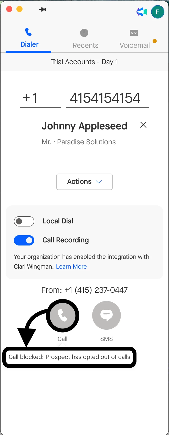 If your team is using Call Opt Out fields to manage whether users can call prospects who have opted out of calls or not, then when users attempt to execute on their call actions in the OmniDialer, they will see that the ‘call’ button is grayed out. When they hover over the ‘call’ button, the following message will surface to indicate why the prospect cannot be called: Call blocked: Prospect has opted out of calls.